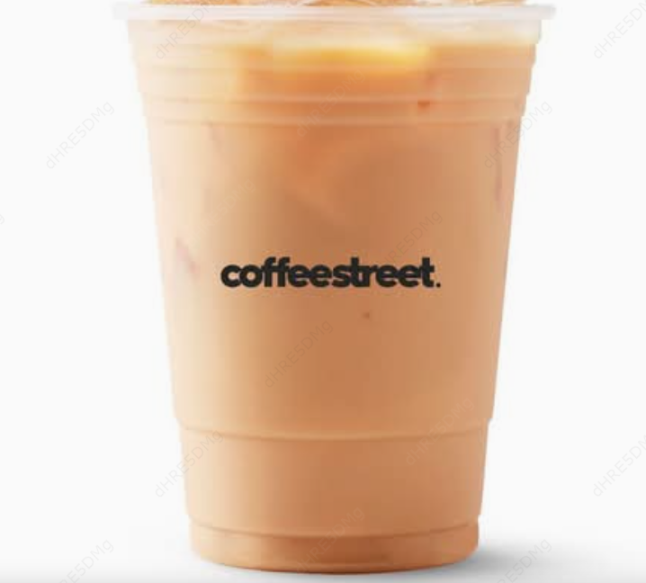 Mezcla de especias y té negro (chai masala 100 % artesanal), con leche y hielos (todas nuestras medidas de bebidas son de 12 oz).