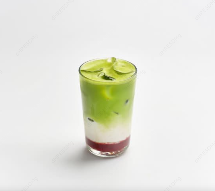 Matcha ceremonial origen Tsuji San (Uji Japón), con syrup de fresa, mezclado con leche y hielos.