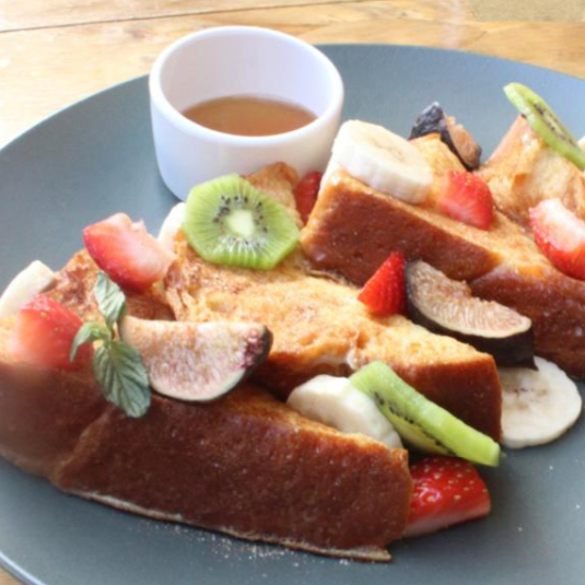 Rebanadas de pan brioche doradas en una mezcla de huevo, leche, nuez moscada ligeramente endulzadas y servidas con azúcar, canela, miel y fruta de temporada.