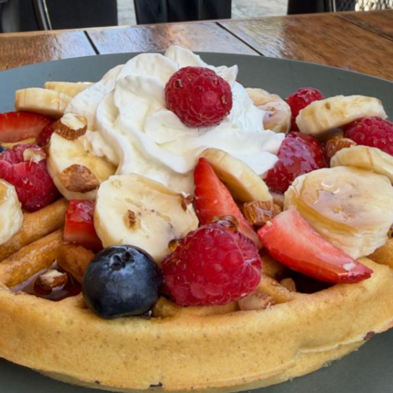 4 Piezas de waffles con topping de crema batida, fruta de temporada y miel.