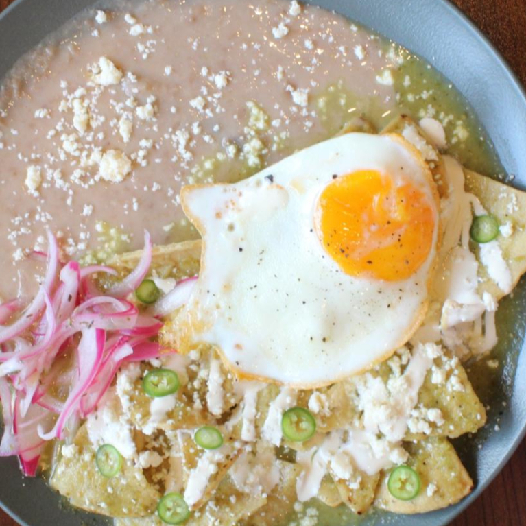 Crujientes totopos de maíz cubiertos en salsa verde, crema, queso y cebolla, acompañados de frijoles y rodajas de chile serrano.