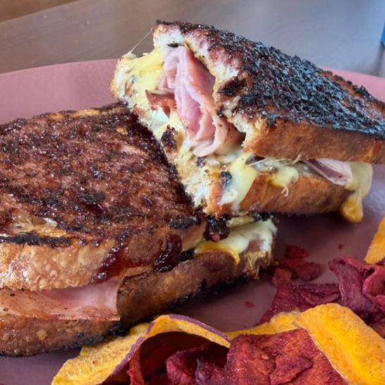 Hogaza de pan de masa madre dorado con mermelada de zarzamora relleno de mostaza dijon, tocino, jamón y queso manchego, acompañado de chips betabel y camote.