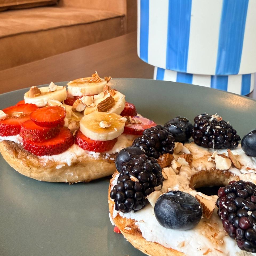 Pan bagel con queso crema o yogur griego, frutos rojos, nuez o almendra y miel.
