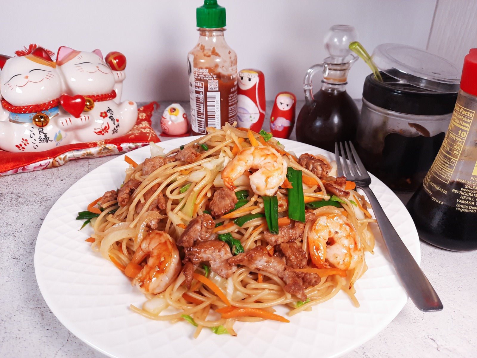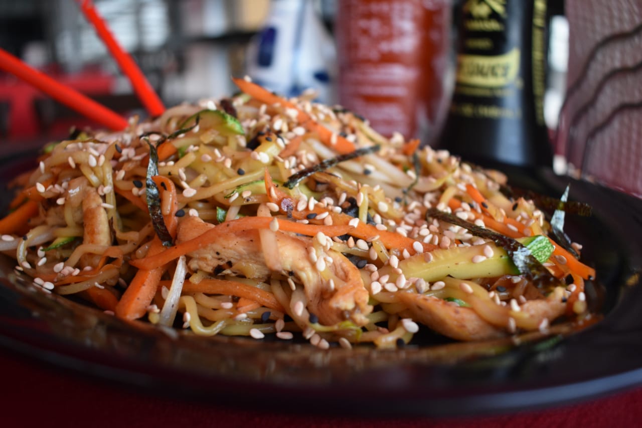 Noodle ramen a la plancha con zanahoria, calabaza, germen de soya, champiñón y nori.