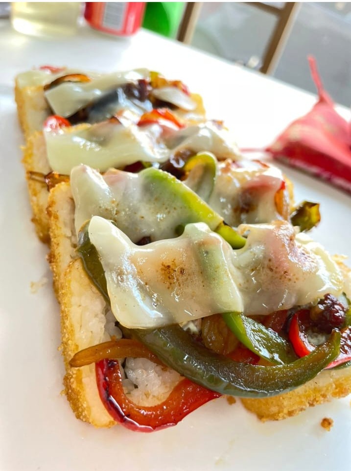 Sushi empanizado relleno con res, queso, aguacate y pepino. Coronado con morrón rojo, verde y cebolla.