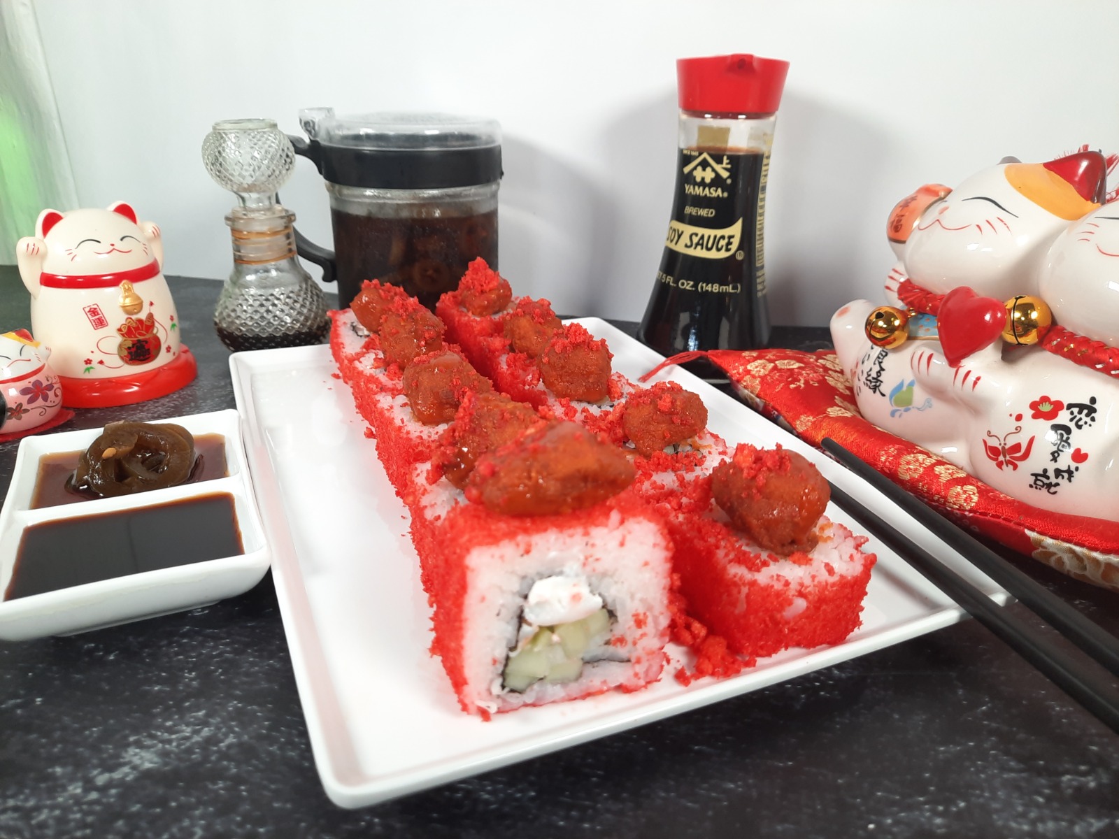 Sushi cubierto con flaming hot, relleno con queso y pepino. Coronado con pollo flaming.