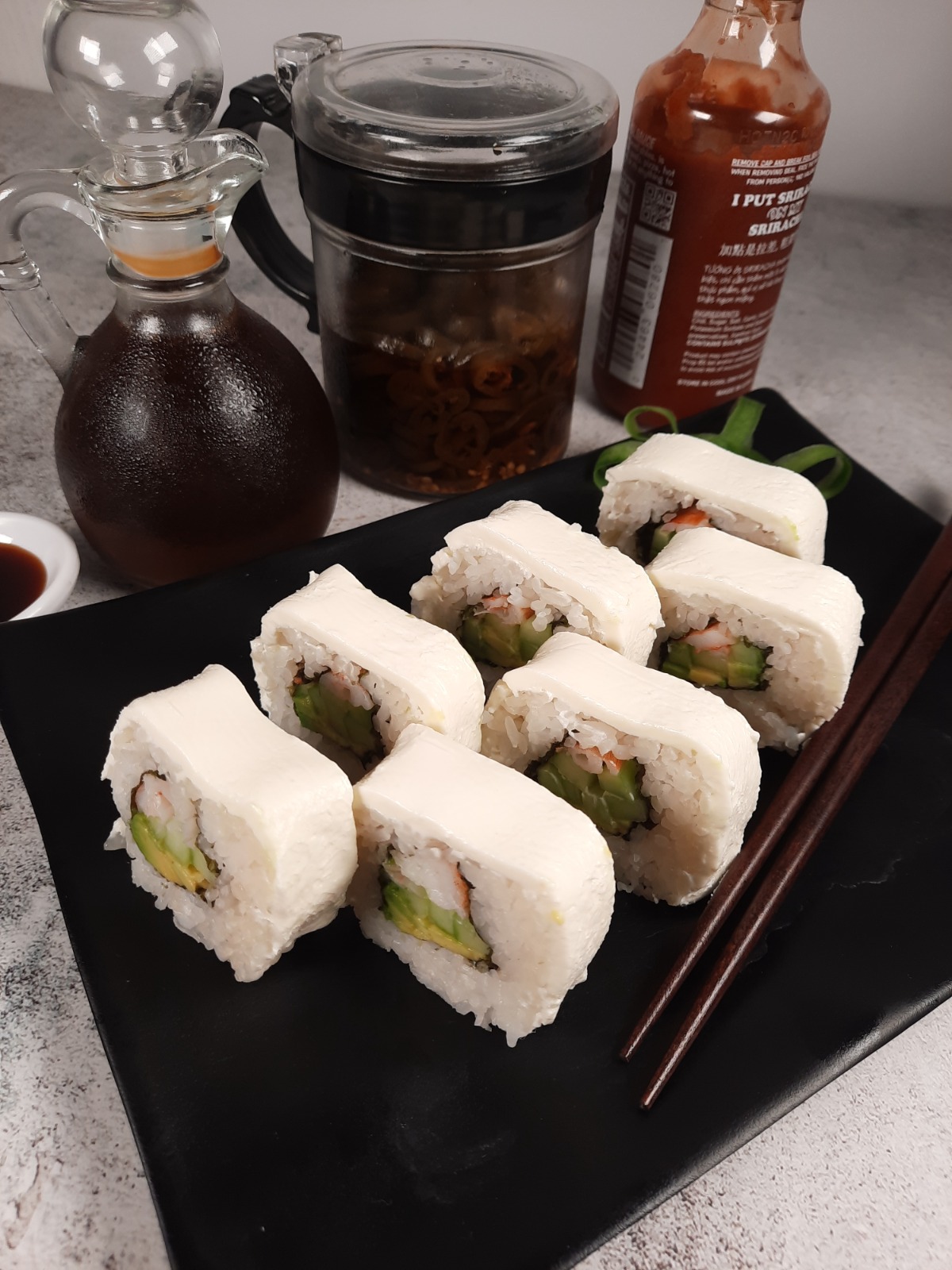 Sushi envuelto en una cama de queso Philadelphia, relleno con aguacate y pepino.
