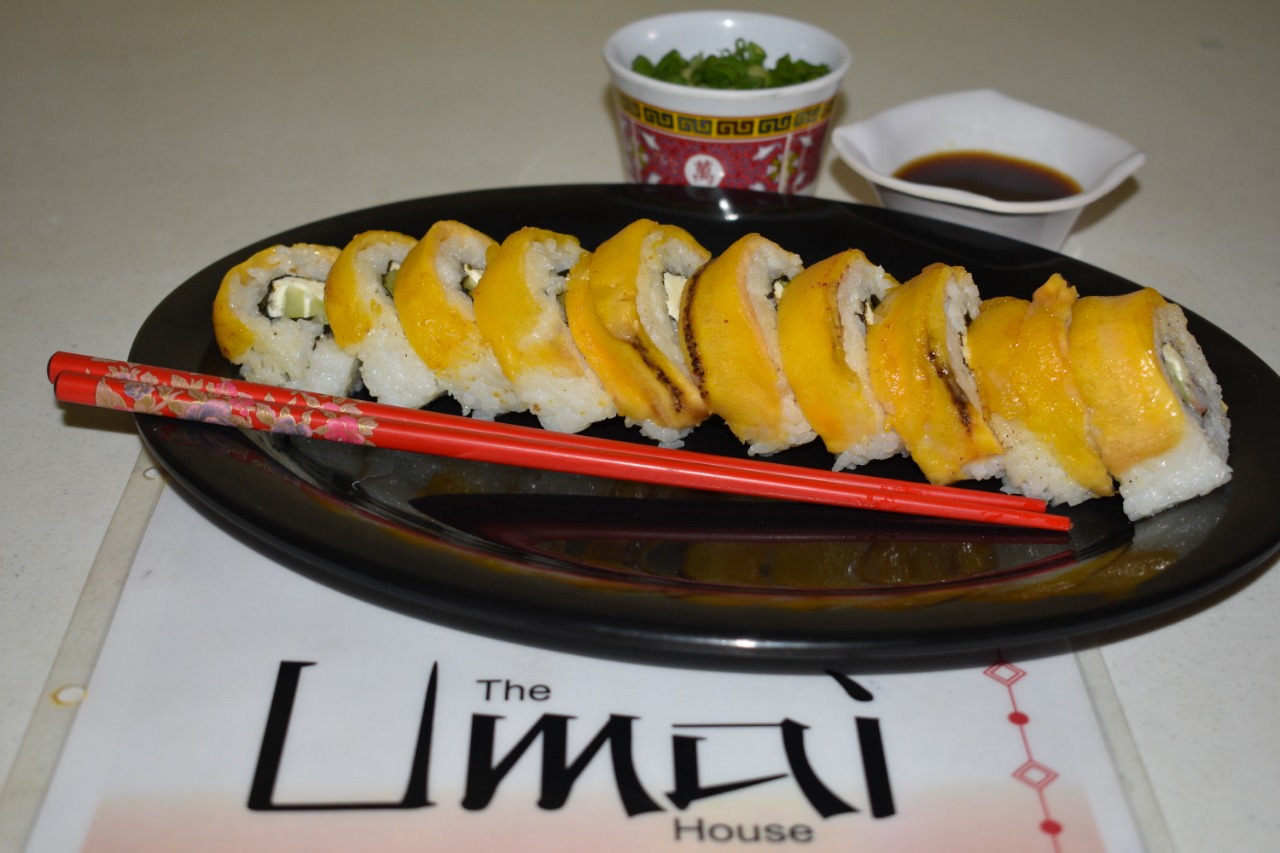 Sushi empanizado, relleno con res, camarón, queso, pepino y aguacate.