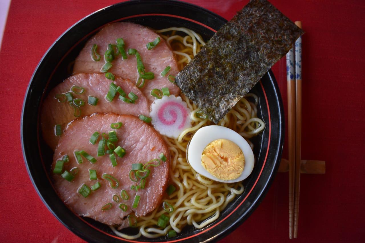 Típica ramen japonesa con huevo, naruto, germen de soya, baby bok choy y nori.