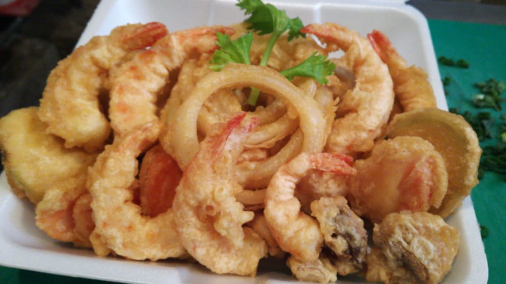 Vegetales fritos: calabaza, zanahoria, berenjena, champiñón y aros de cebolla.
