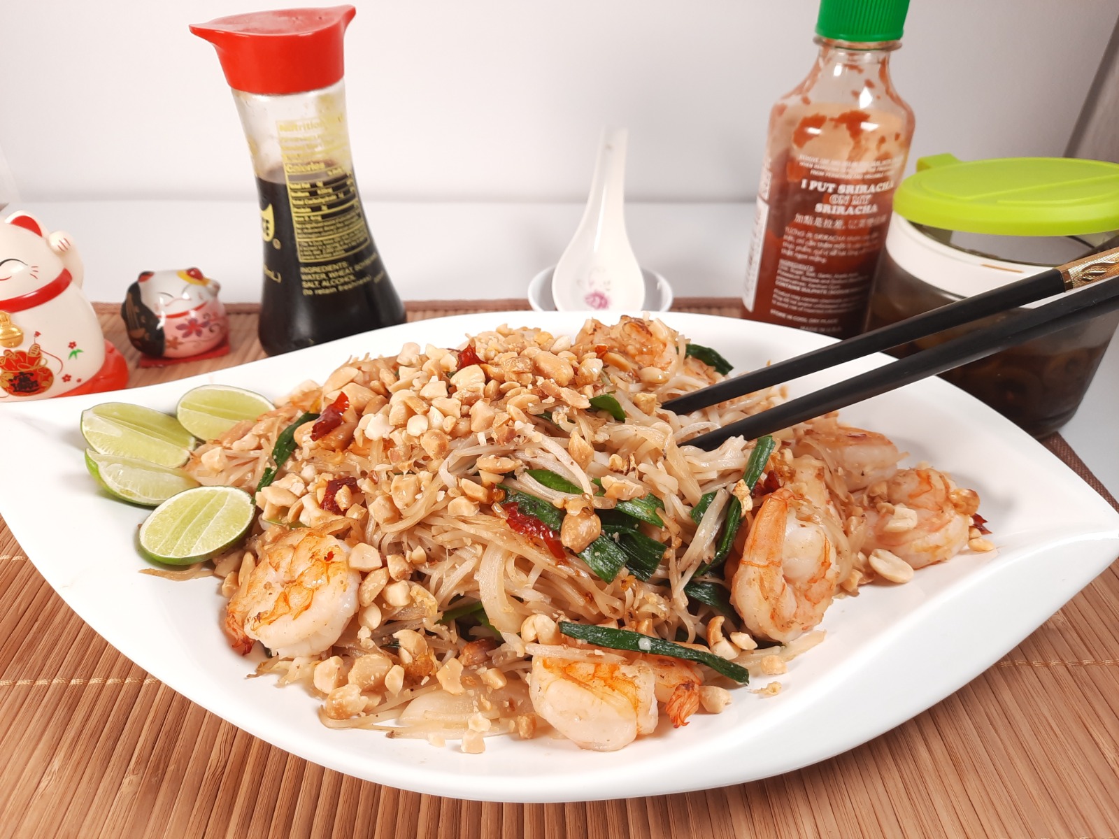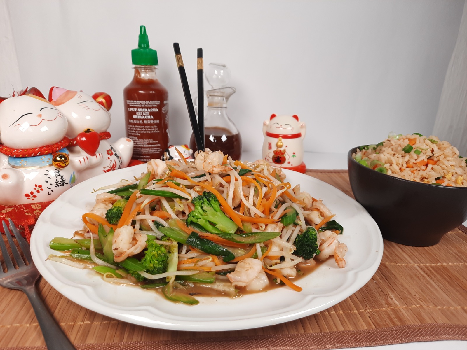 Tallarín de arroz salteado con germen de soya, cebollín, huevo revuelto, cebolla y cacahuate.