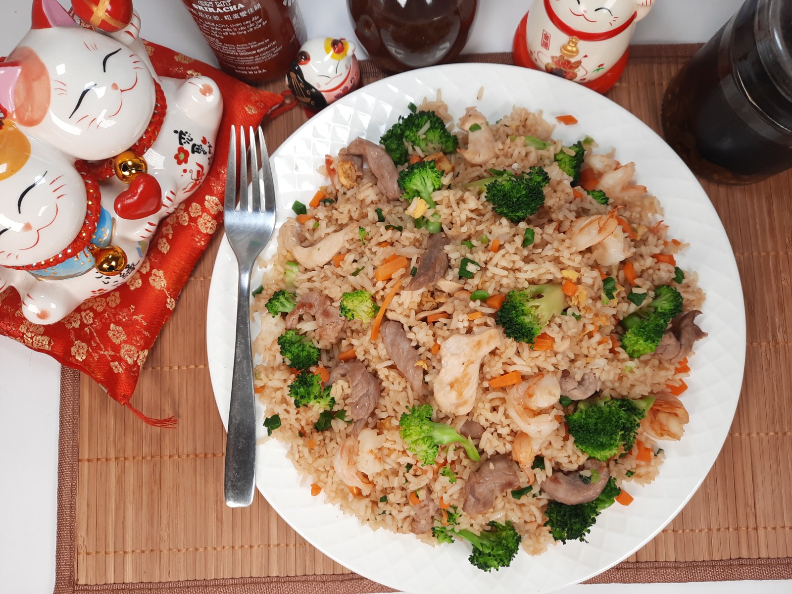 Arroz frito con cebollín, zanahoria y huevo revuelto.