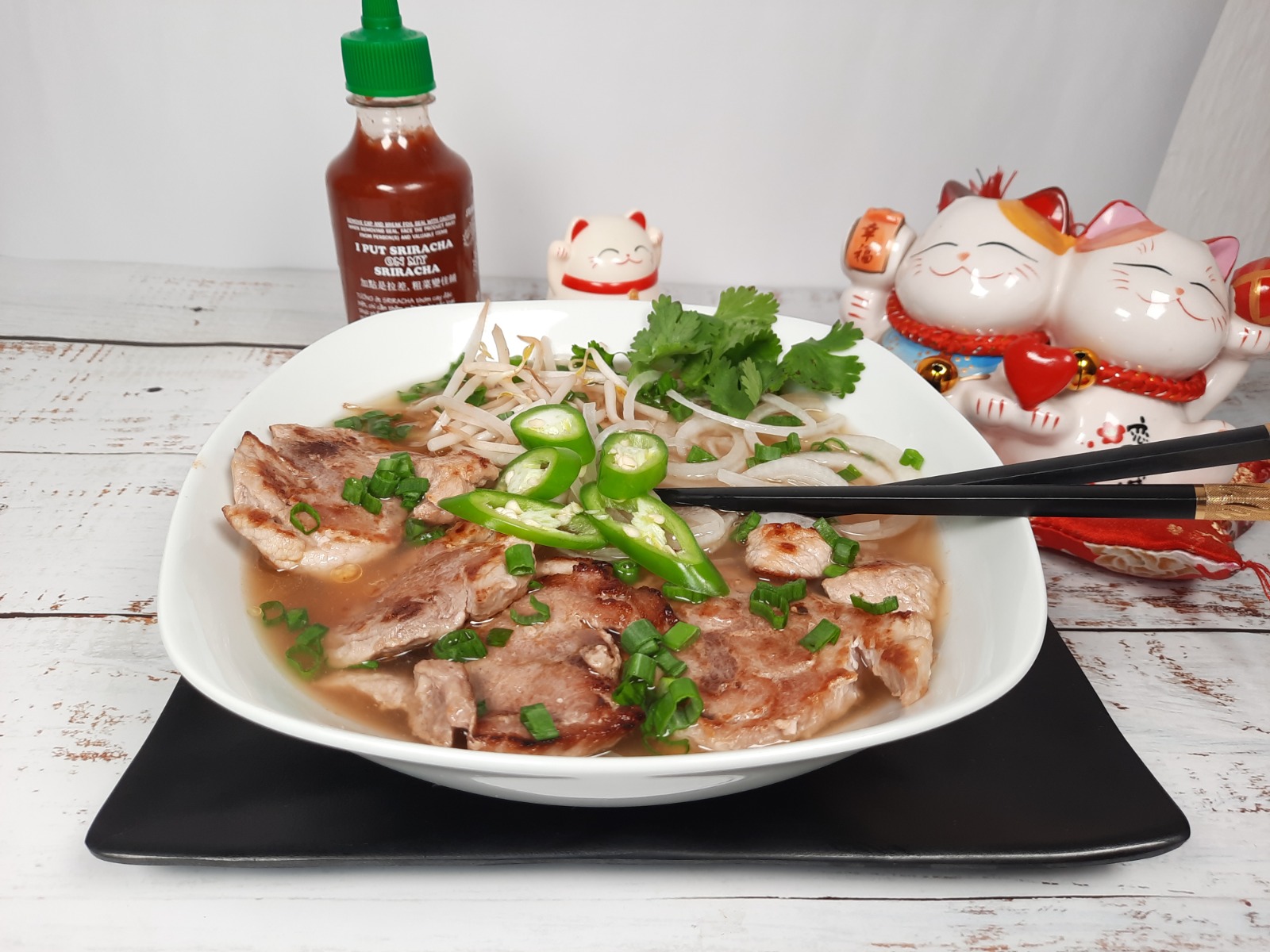 Caldo a base de soya y jengibre, fideo de arroz y wonton.