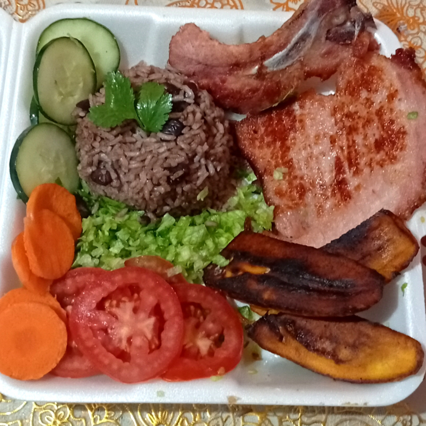 Agua de Jamaica*1 + Arroz congrí*1 + Chuleta ahumada*1 + Plátano frito*1