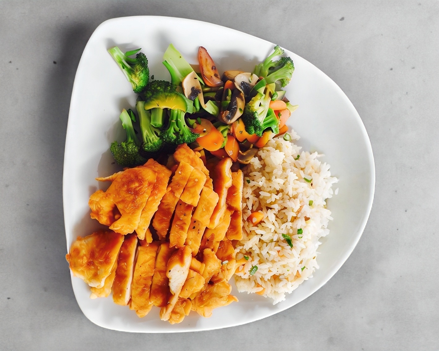 Pechuga de pollo a la plancha con cebolla, champiñón y salsa teriyaki con una cama de arroz frito.