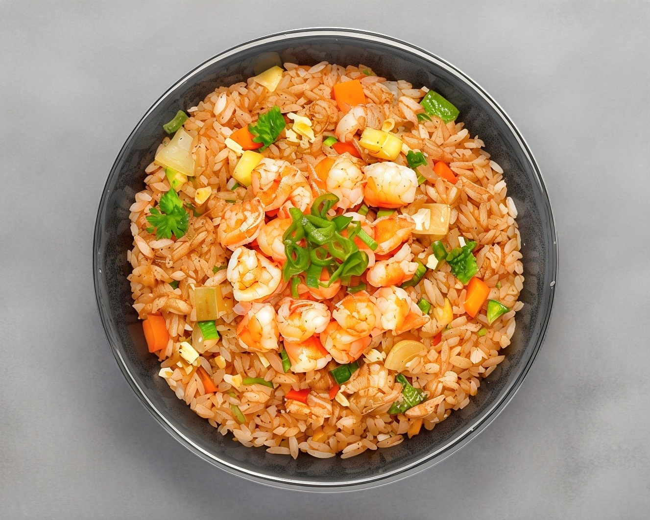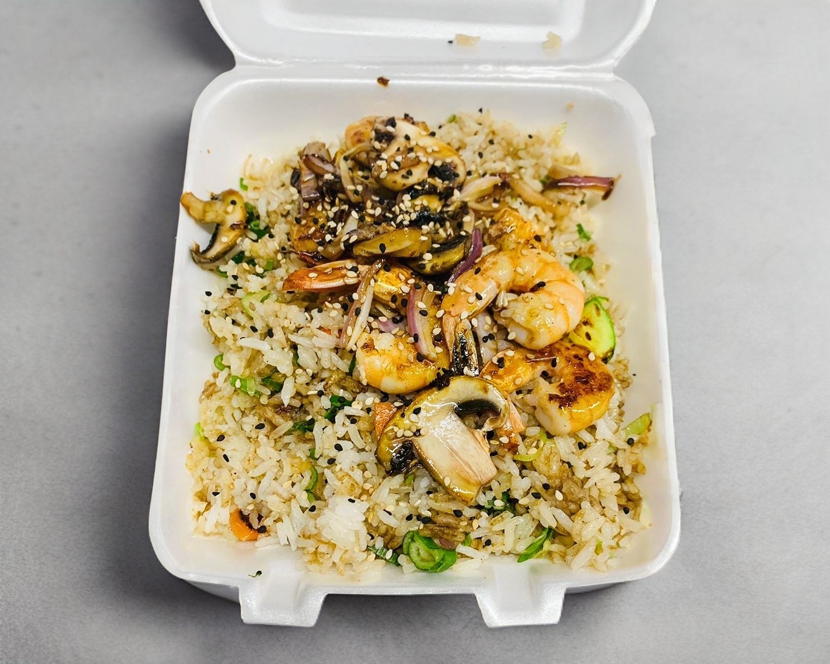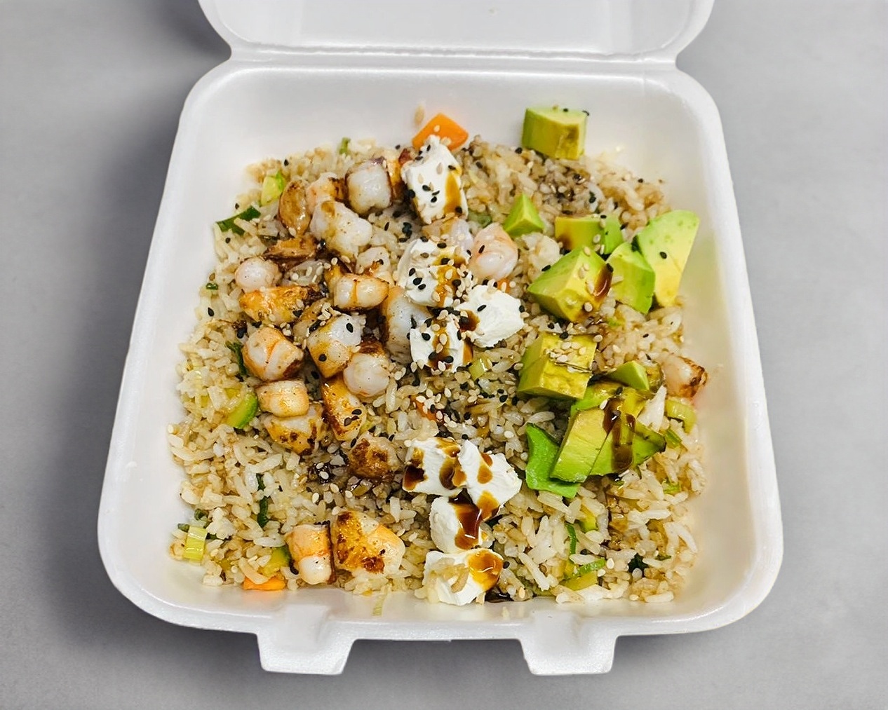 Pescado, camarón, surimi, jitomate, brócoli, champiñón, cebolla, aderezo y queso gratinado, arroz frito.