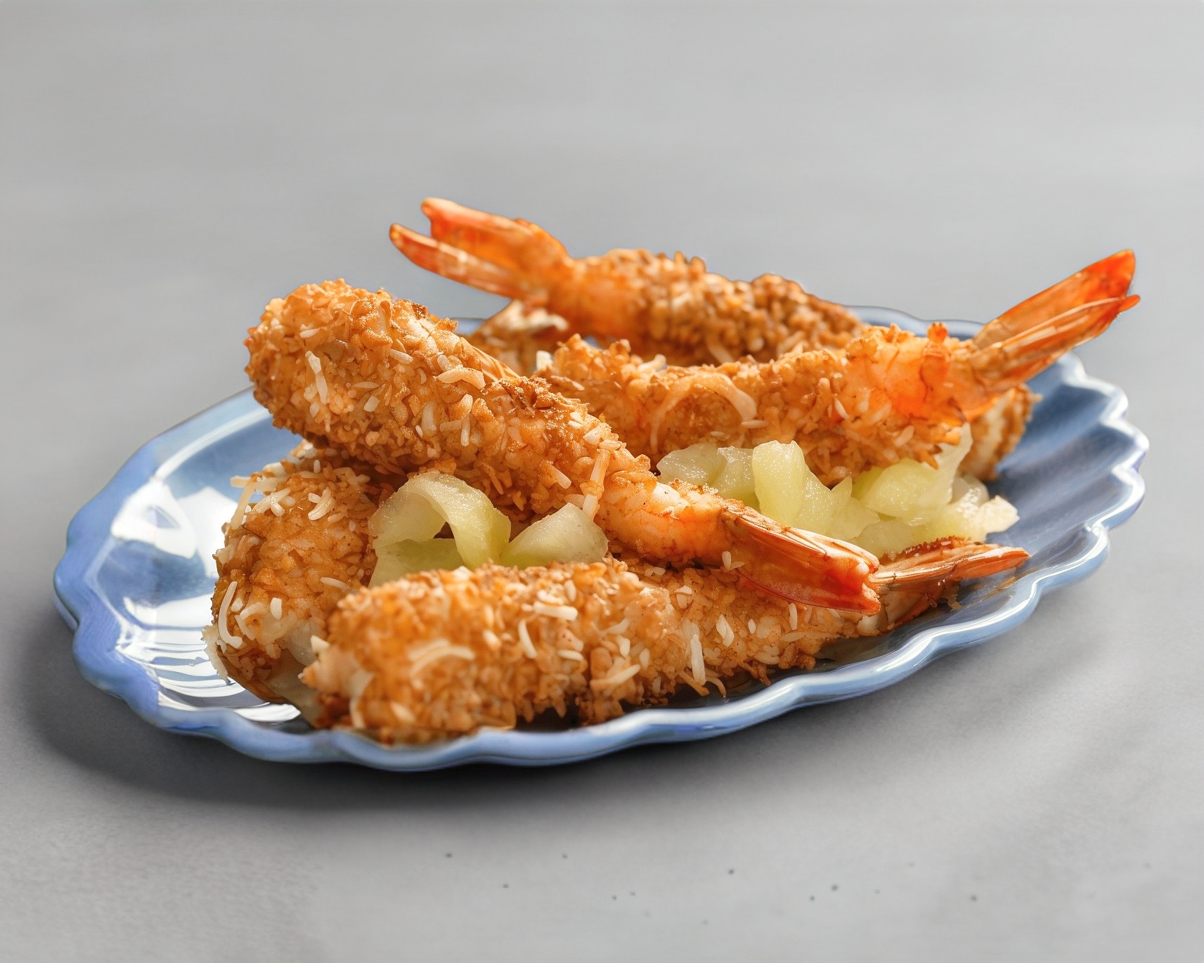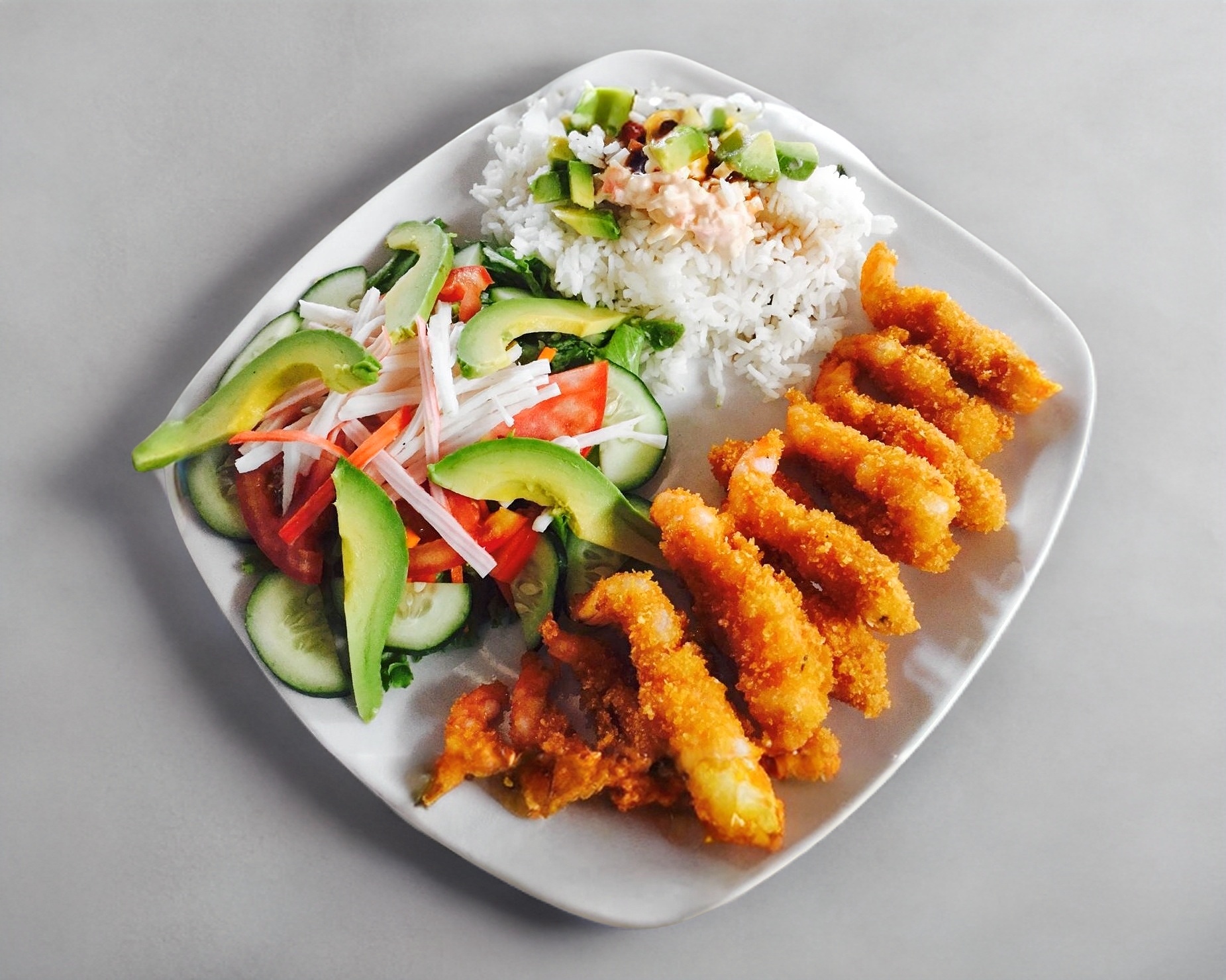 Camarones empanizados con coco rallado, arroz frito y ensalada fresca.