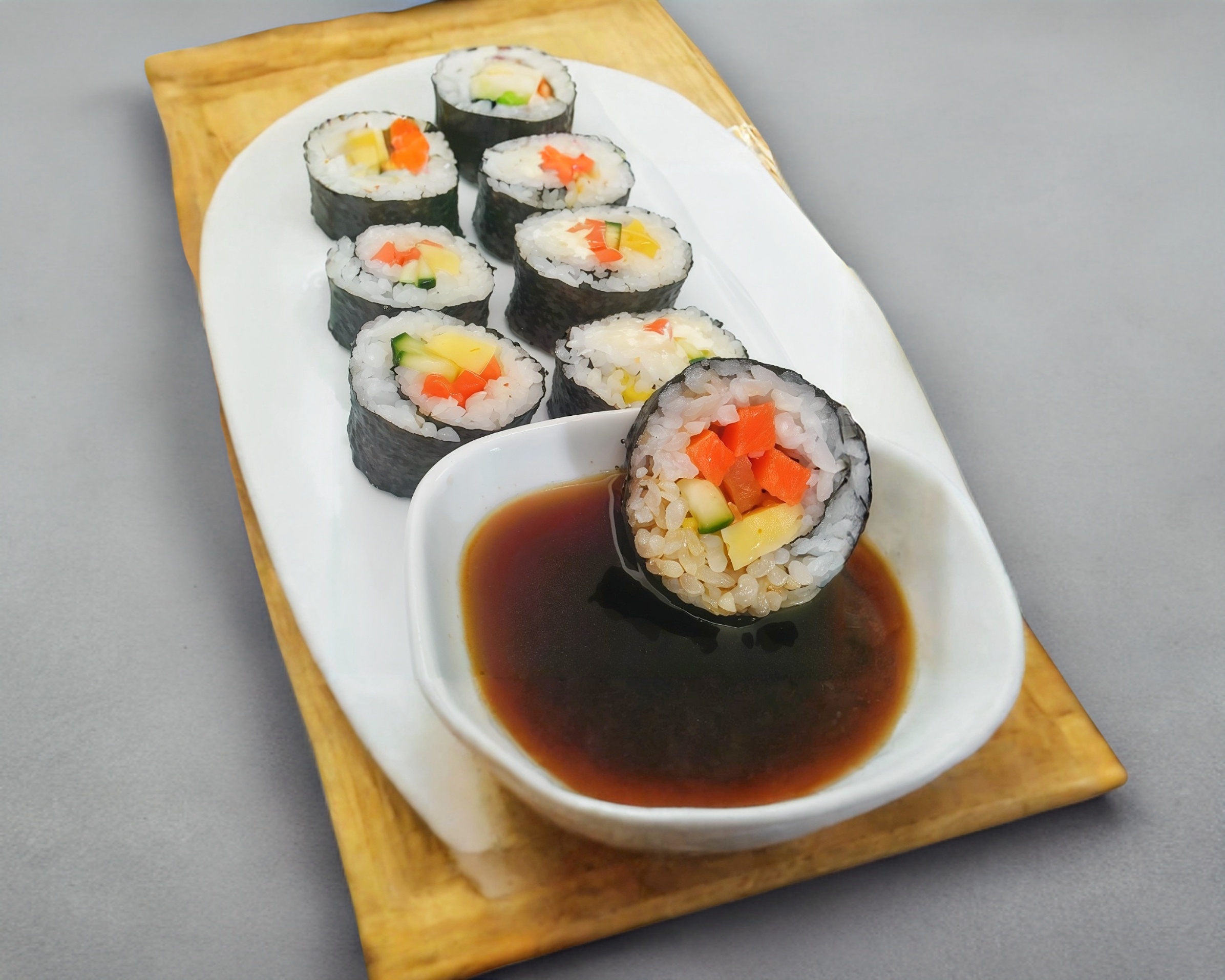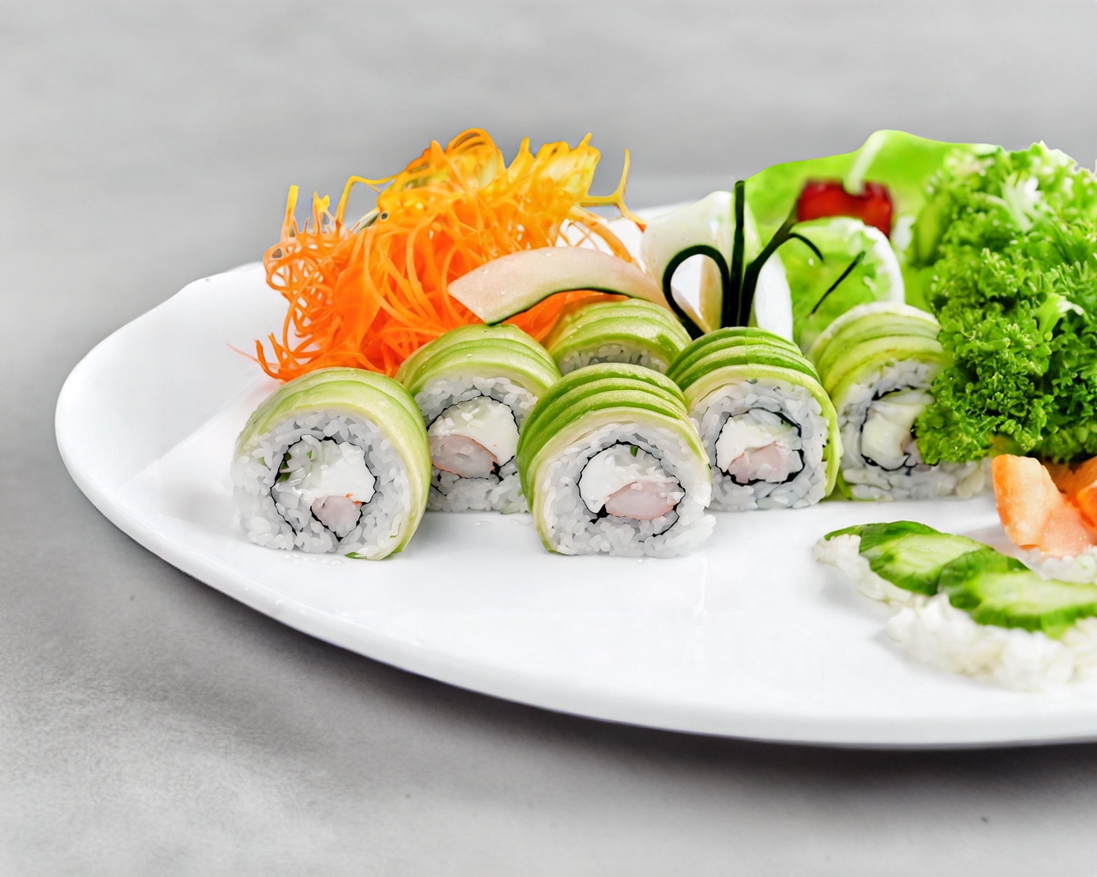 Camarón o surimi, philadelphia, pepino y aguacate por dentro, plátano macho por fuera.