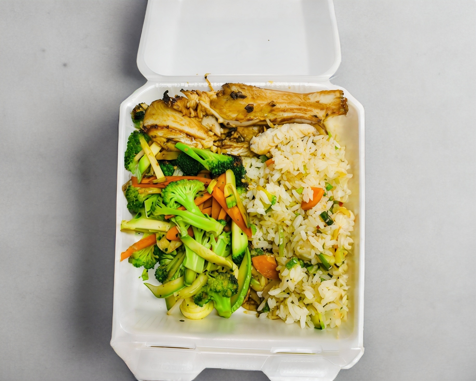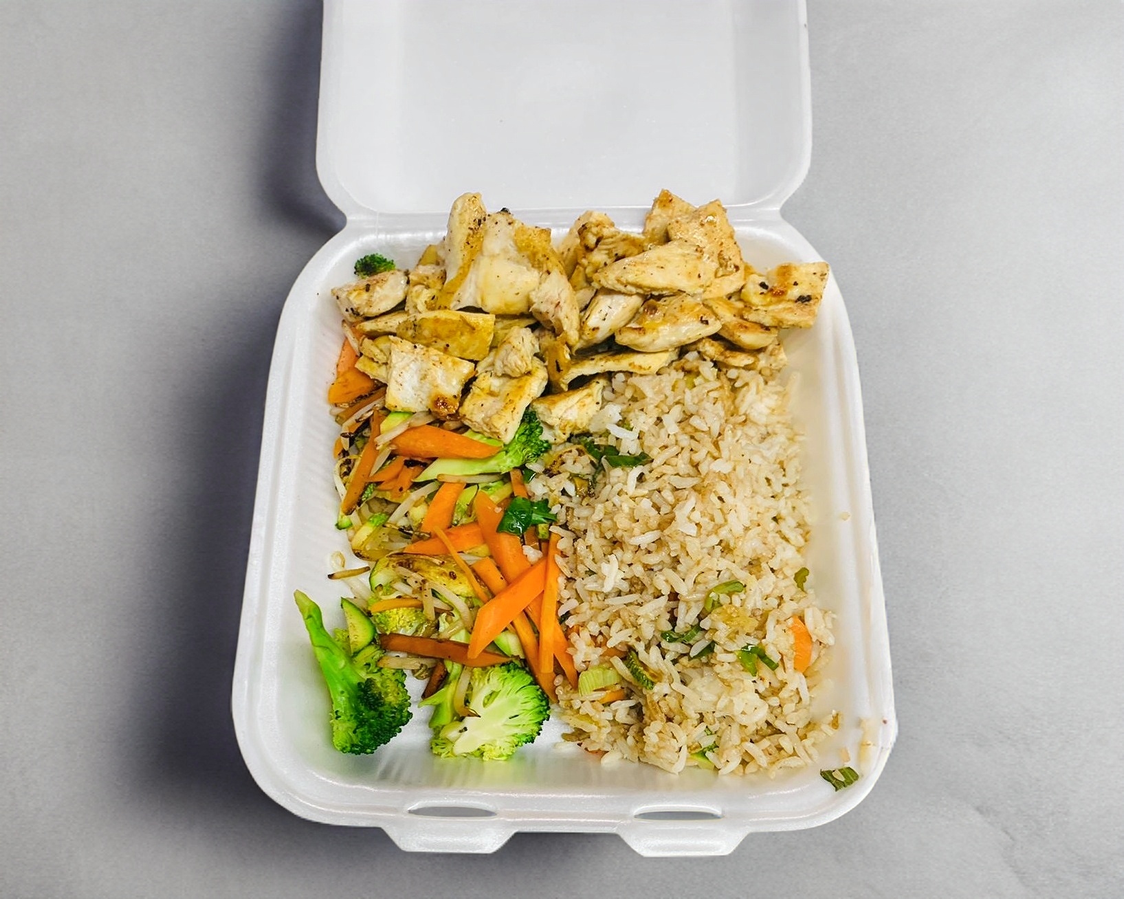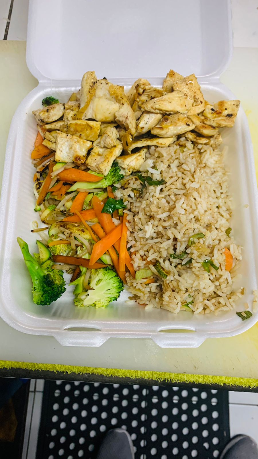Verduras salteadas a la plancha, con arroz frito y pechuga de pollo a la plancha.