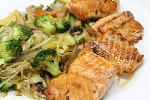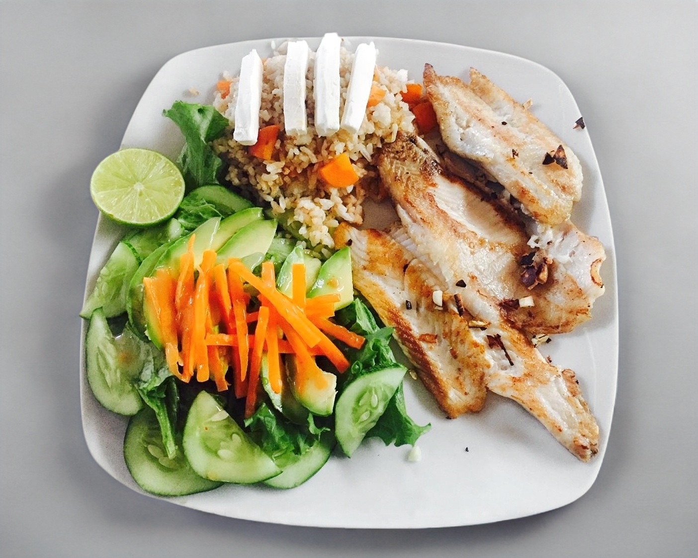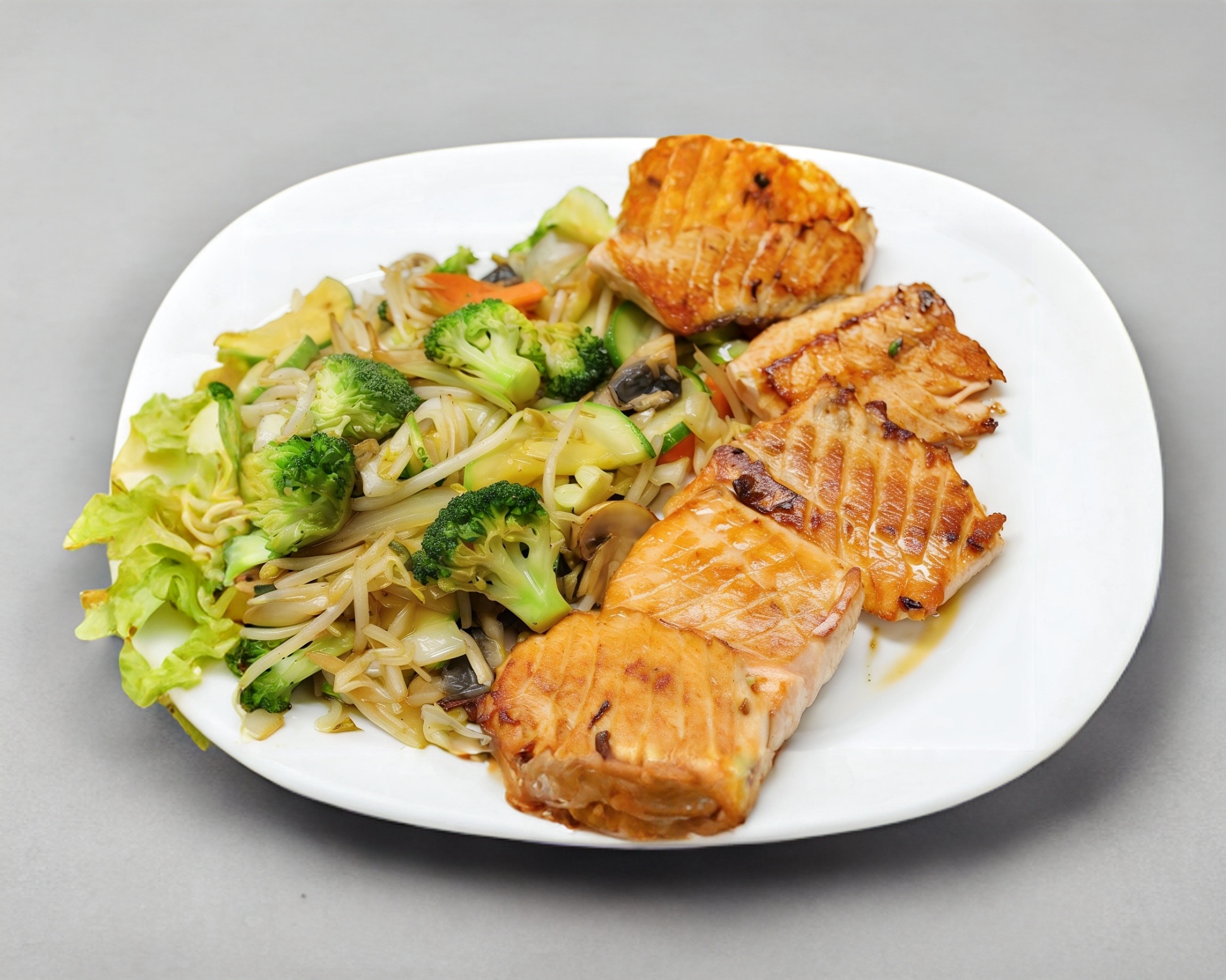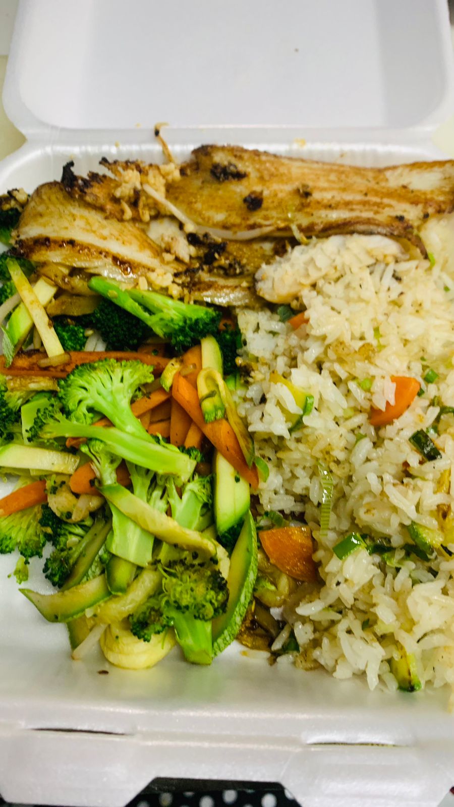 Verduras salteadas a la plancha, arroz frito y pescado a la plancha.