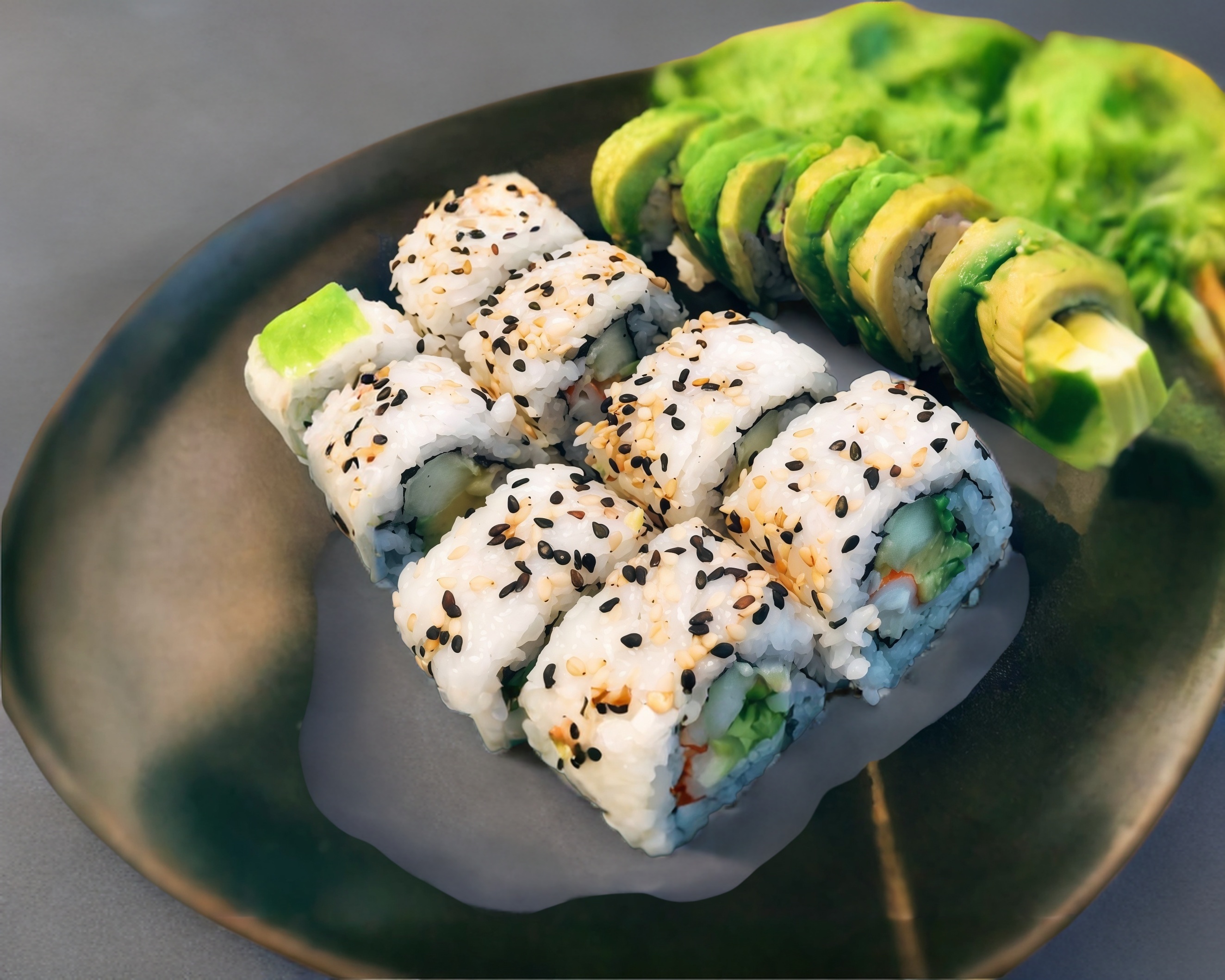 Camarón o surimi, queso philadelphia y pepino, aguacate pro fuera.