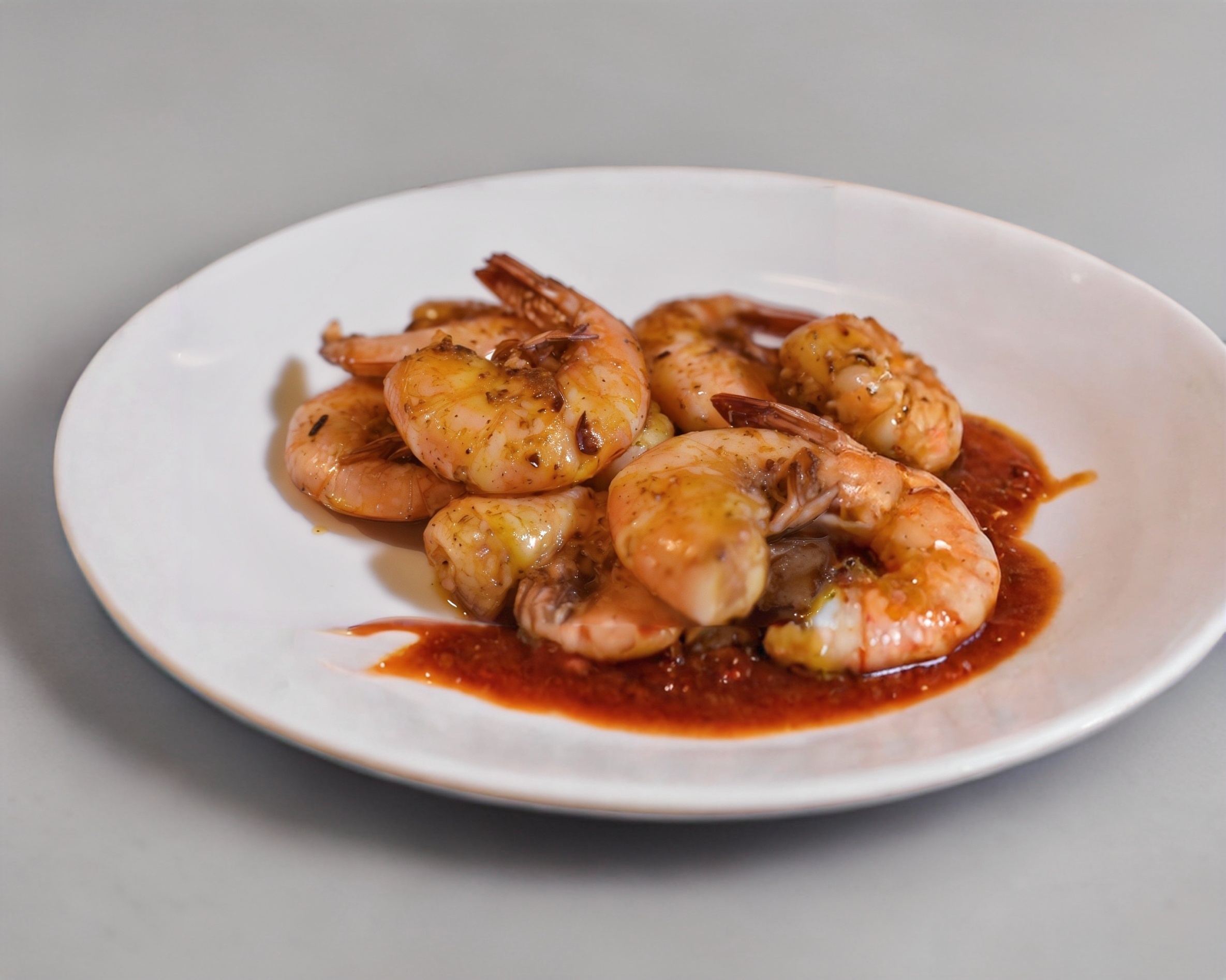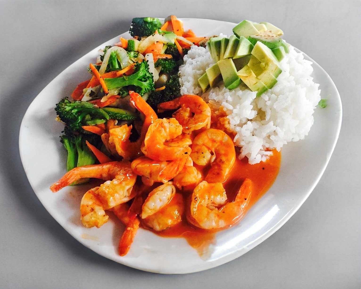 Camarones con salsa a la diabla (salsa de la casa) con arroz frito y ensalada fresca.