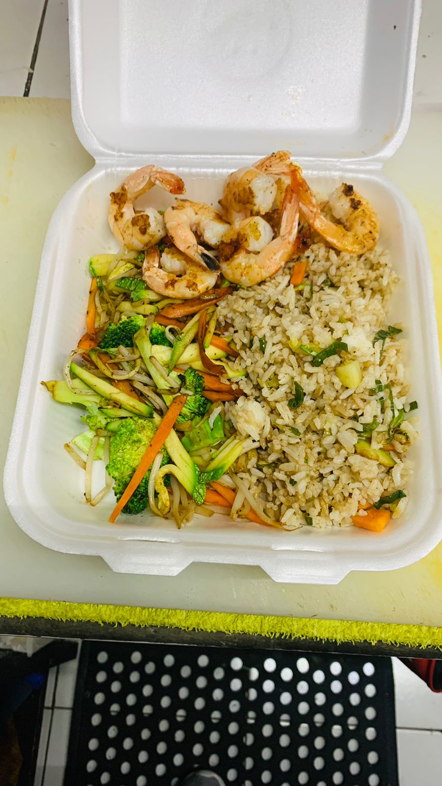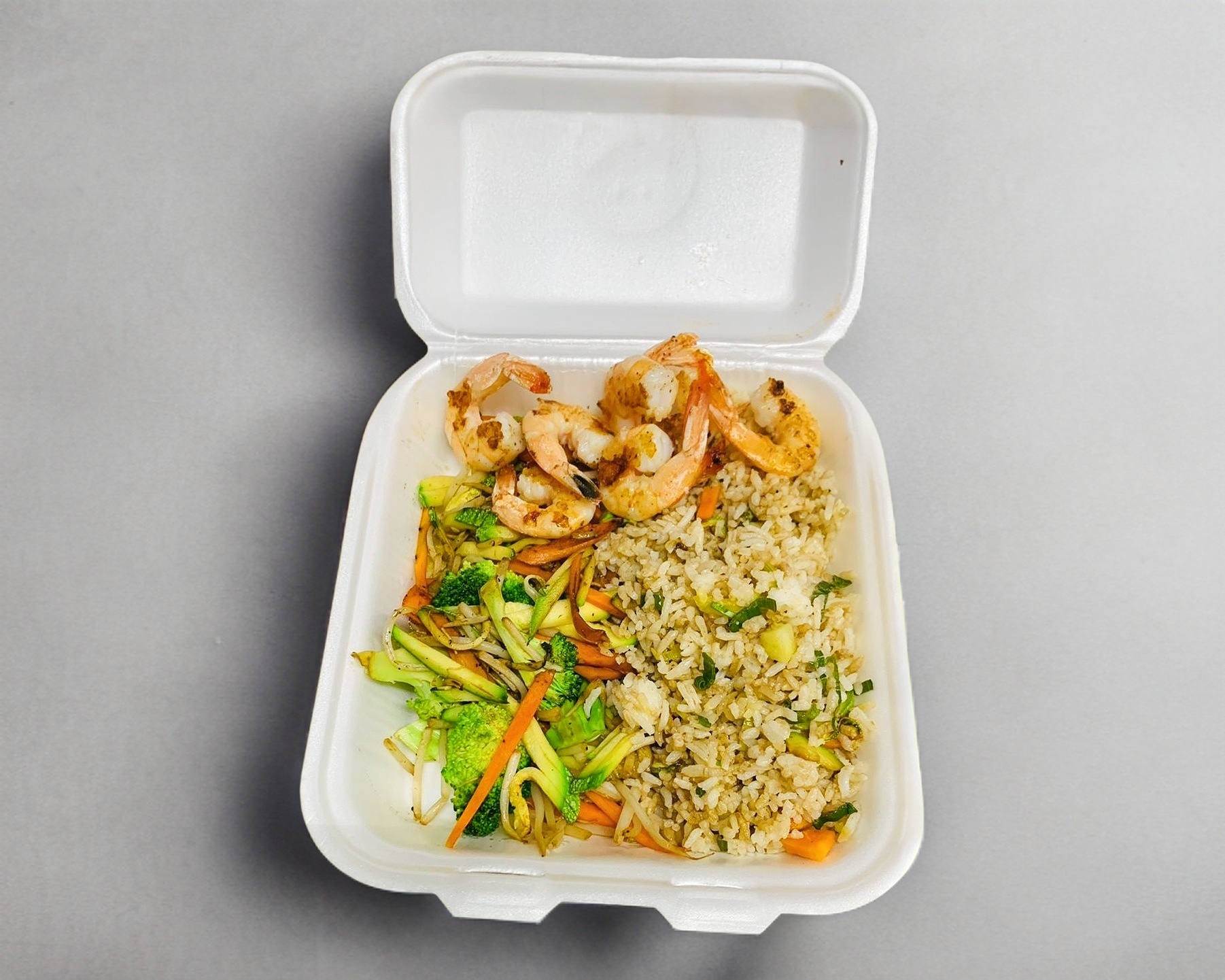 Verduras salteadas a la plancha, arroz frito y camarones a la plancha.