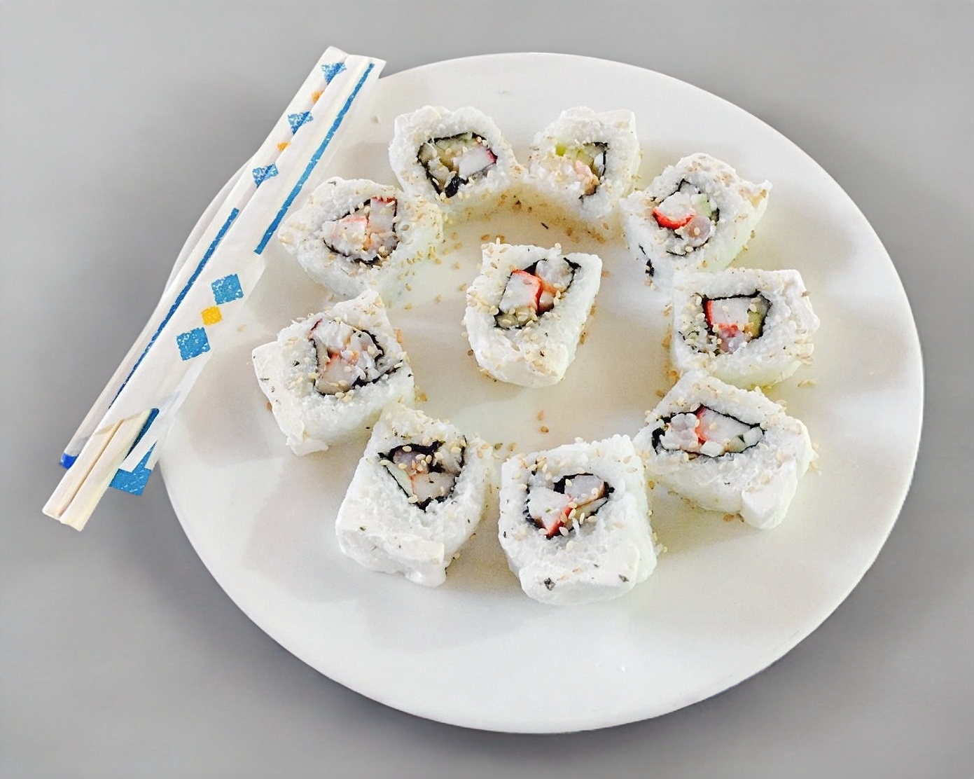 Camarón o surimi, philadelphia, pepino y aguacate por dentro.