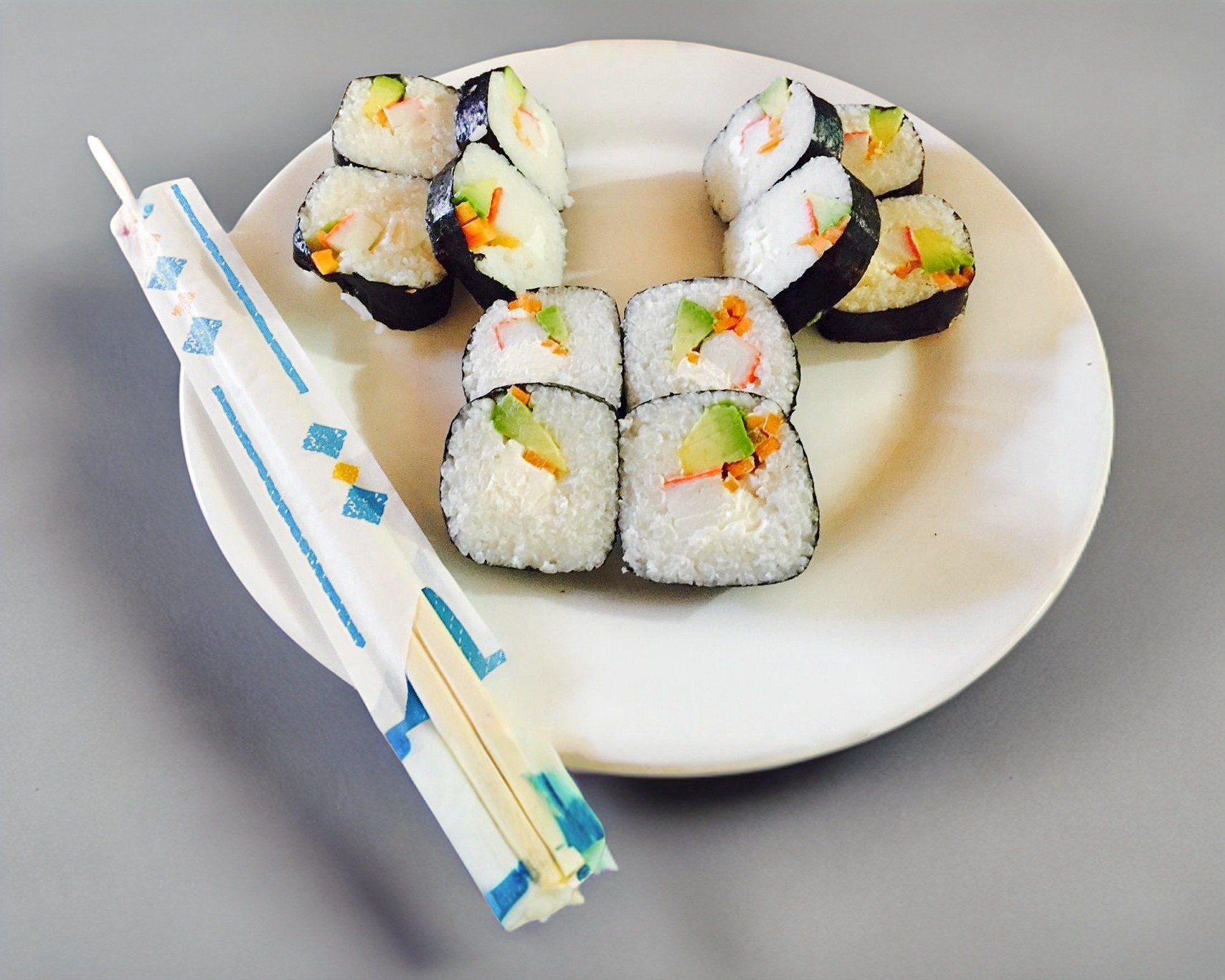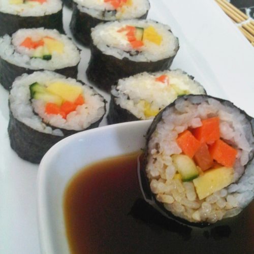 De camarón o surimi con pepino y aguacate por dentro y queso philadelphia por fuera.