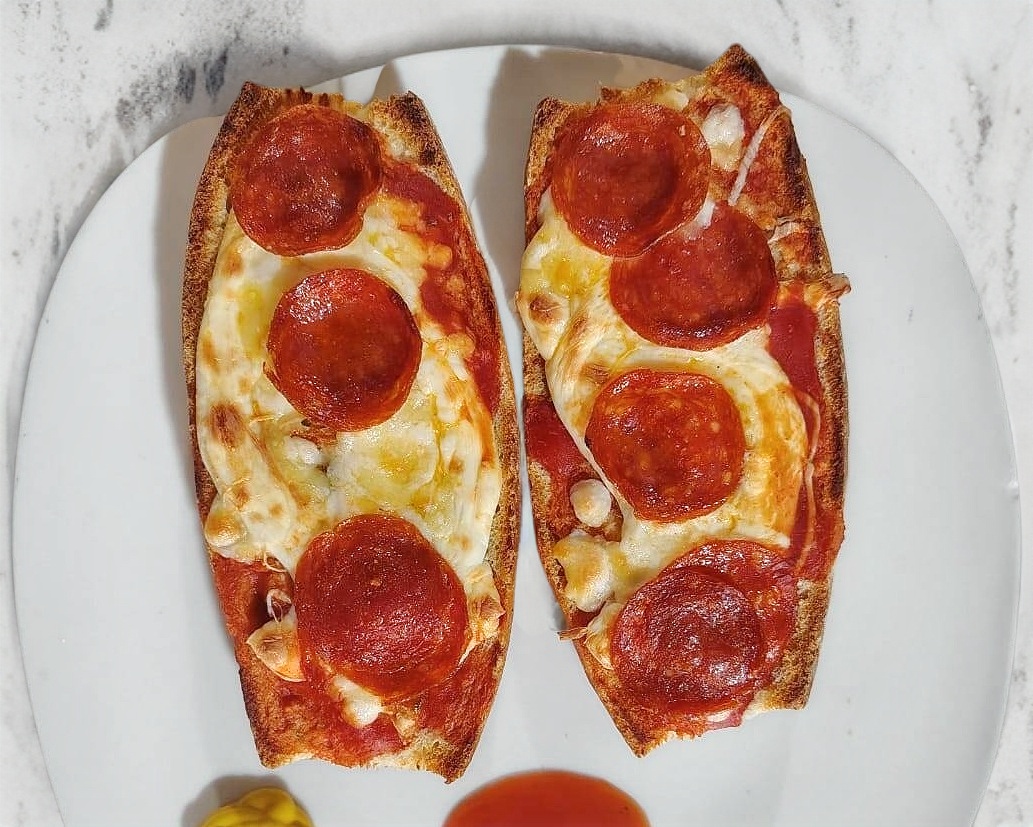 Bolillo completo cortado a la mitad, con salsa de tomate sazonada, queso y peperoni, se acompaña de catsup, mostaza y salsa picante