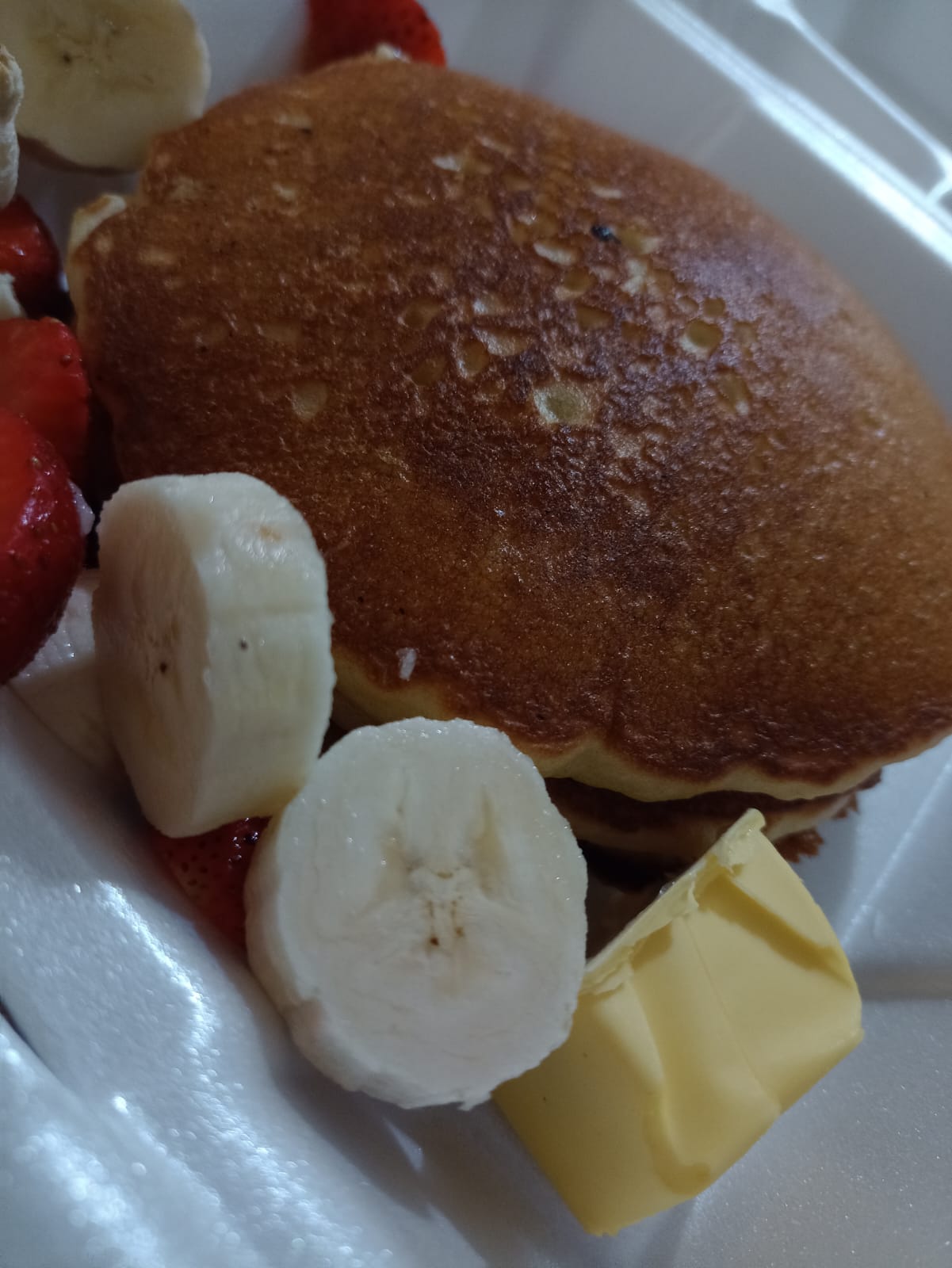 Dos Hot cakes medianos, dos huevos revueltos, dos tiras de tocino y miel maple