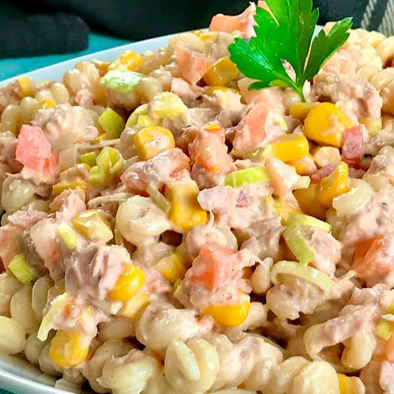 Deliciosa ensalada con pasta, zanahoria, elote, crema, mayonesa, lechuga, proteína y acompañamientos.