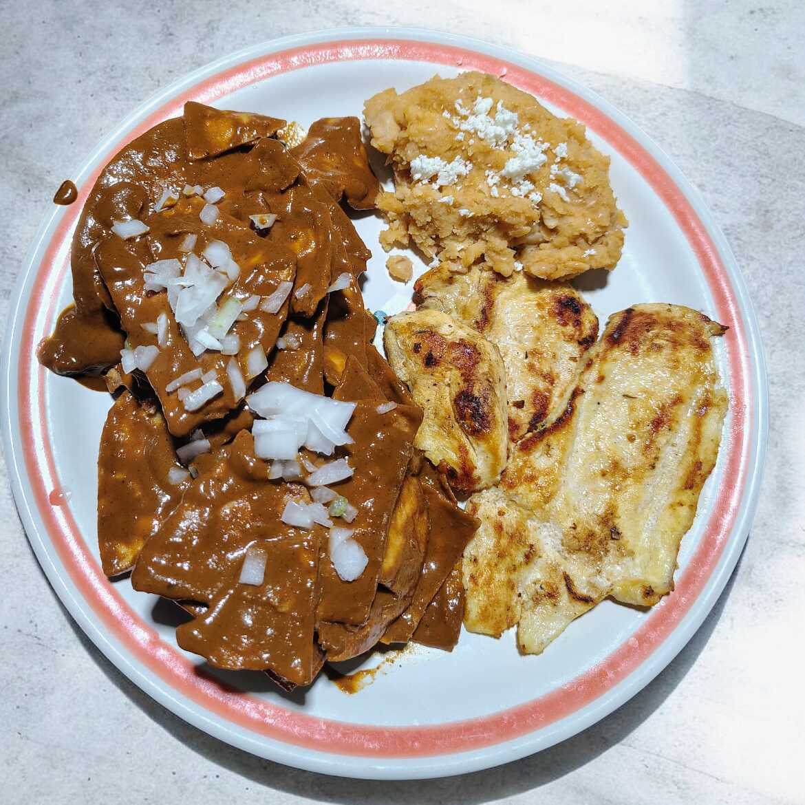 Deliciosos totopos salceados en mole, acompanados de filete de pollo a la plancha, frijoles refritos y pan.