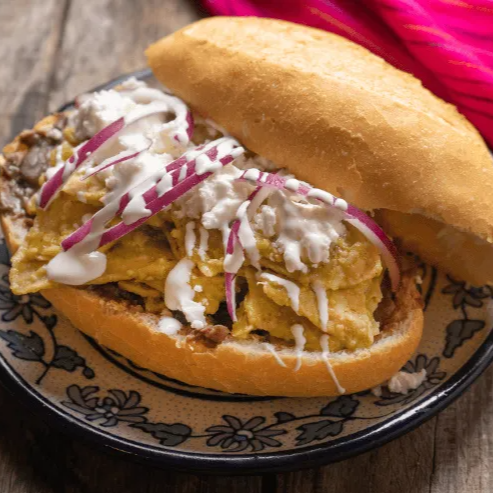Acompañado de jamón, jitomate, cebolla crema y lechuga.