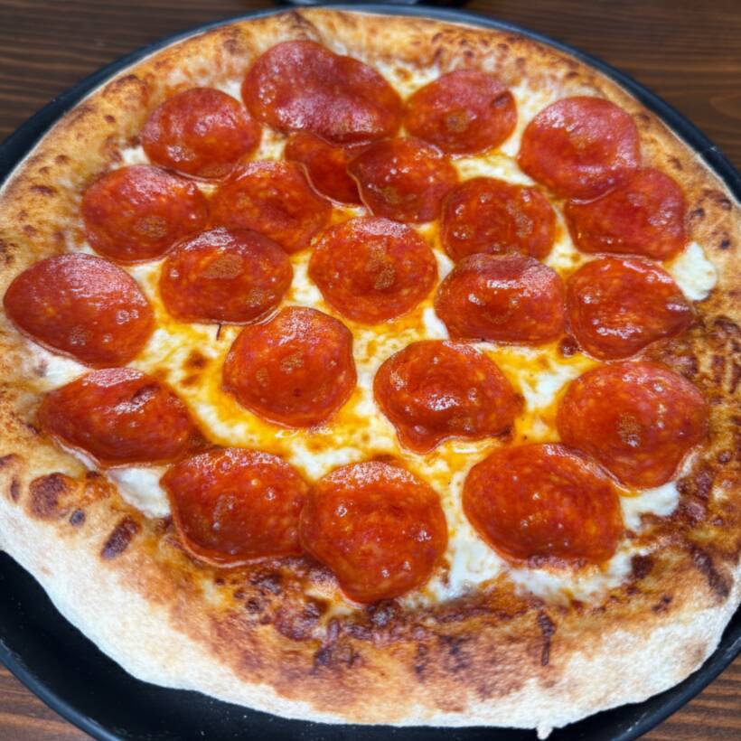 Pizza de 25cm con Pepperoni y queso mozzarella, en masa artesanal de alta proteína y fermentación lenta.