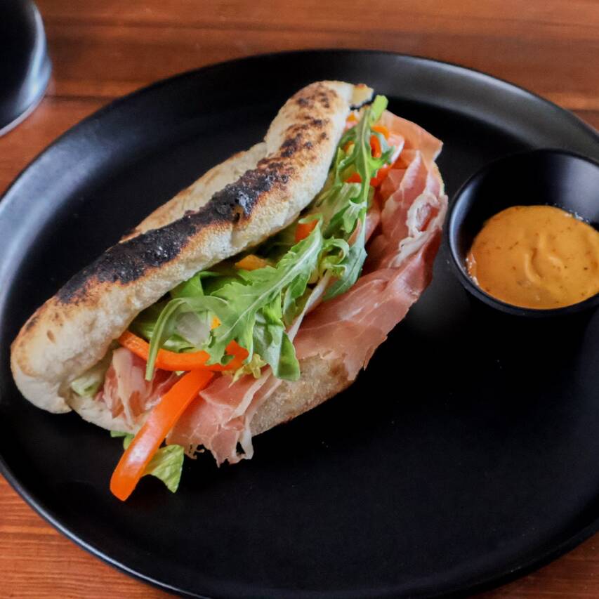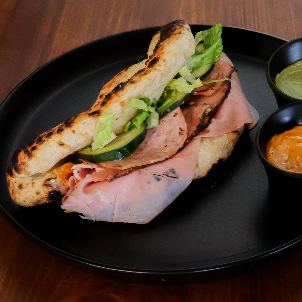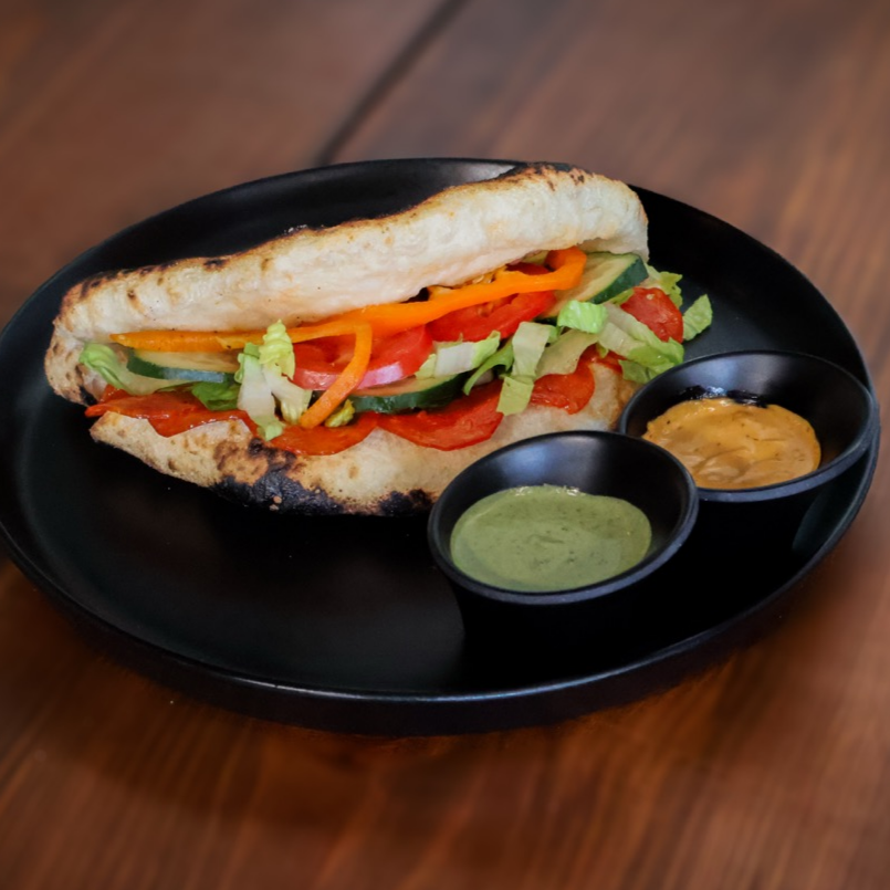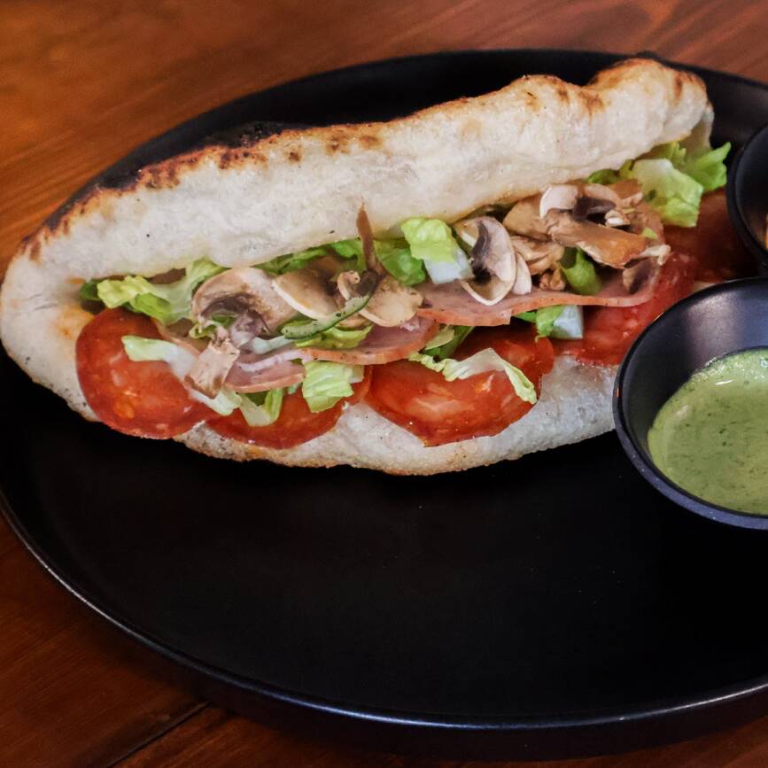 Jamón de pierna, Selva Negra, Salami y queso mozzarella en masa de pizza que se abre como baguette, acompañada de tu selección de vegetales y aderezos de cilantro y Chipotle.
