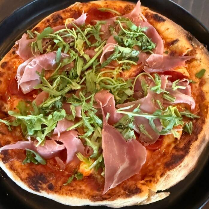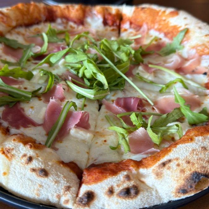Pizza de 25cm con Jamón serrano, arúgula, queso mozzarella y parmesano, en masa artesanal de alta proteína y fermentación lenta.