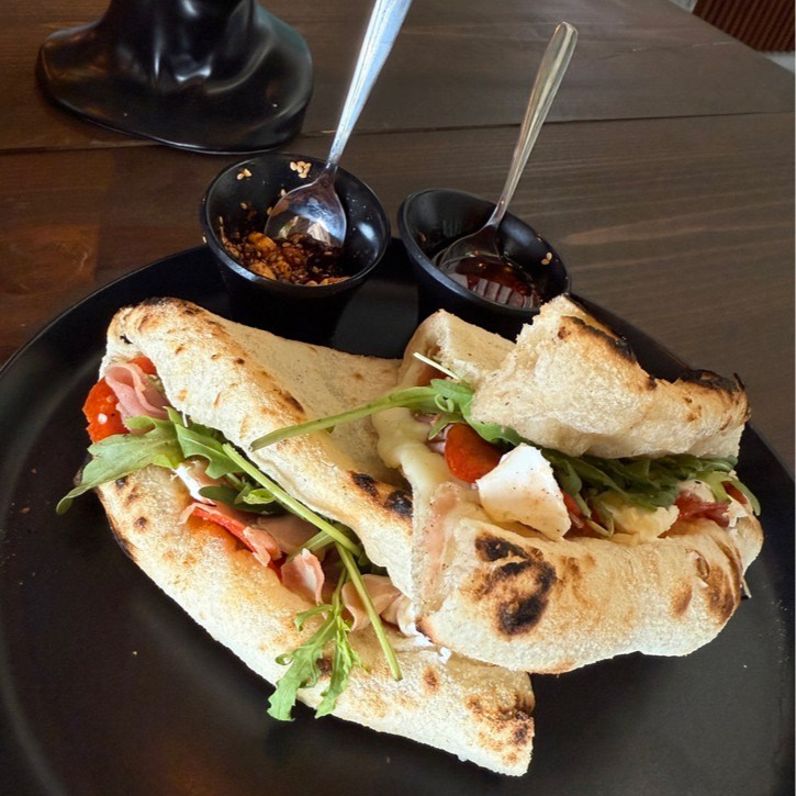 Jamón serrano, arúgula, queso parmesano y queso mozzarella en masa de pizza que se abre como baguette, acompañada de tu selección de vegetales y aderezos de cilantro y Chipotle.