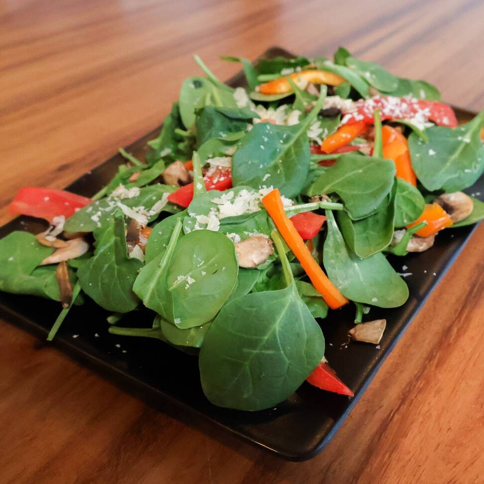 Espinaca baby, tomate cherry, champiñones, pimiento morrón, queso parmesano y aderezo.