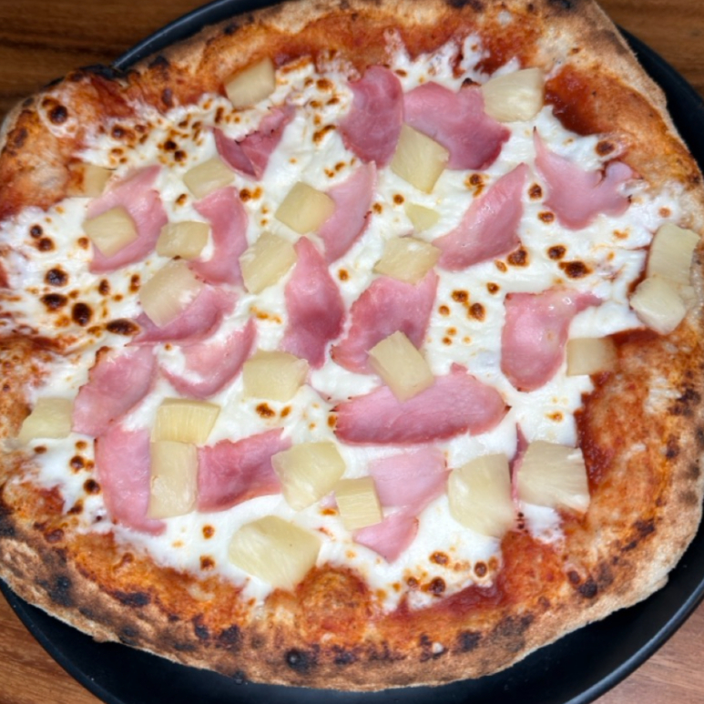 Pizza de 25cm con Jamón de pierna y trocitos de piña, queso mozzarella, en masa artesanal de alta proteína y fermentación lenta.