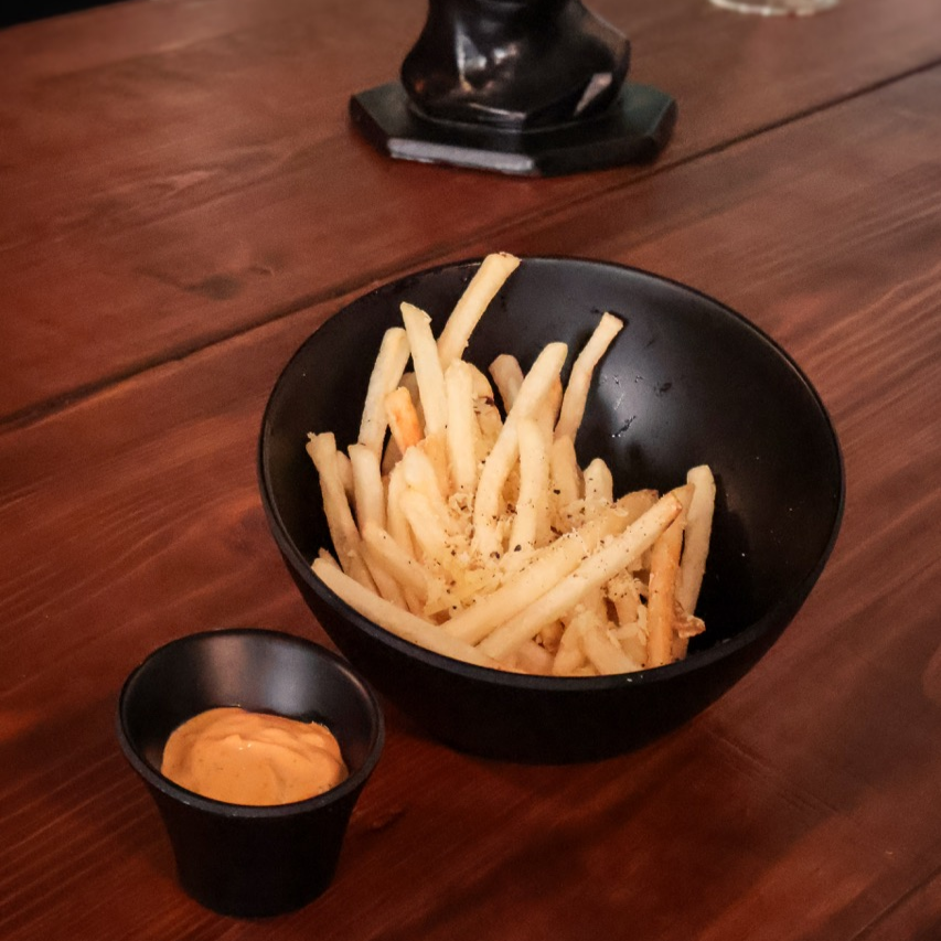 Papas a la francesa con aceite de trufa y queso parmesano recién rayado.