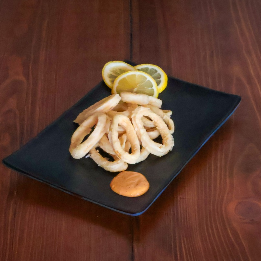 180 gramos de aros de calamar en capeado, crujiente, acompañados de limón real y alioli de ajo, hecho a mano.