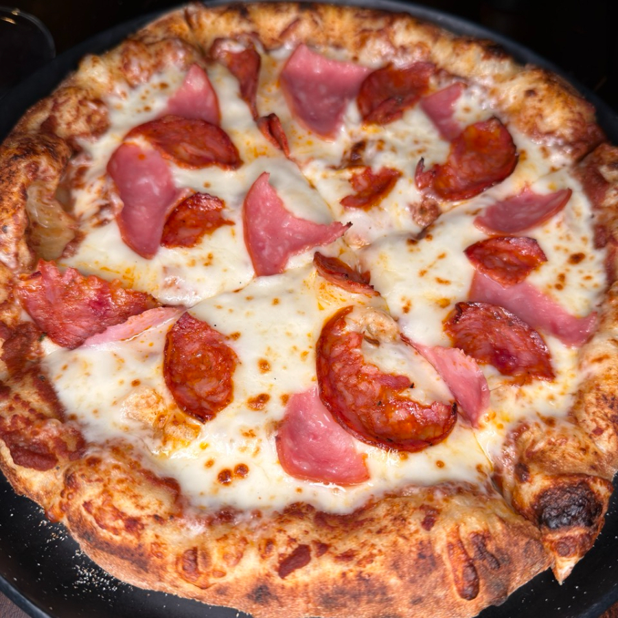 Pizza de 25cm con Chorizo de Pamplona, salami y queso mozzarella, en masa artesanal de alta proteína y fermentación lenta.
