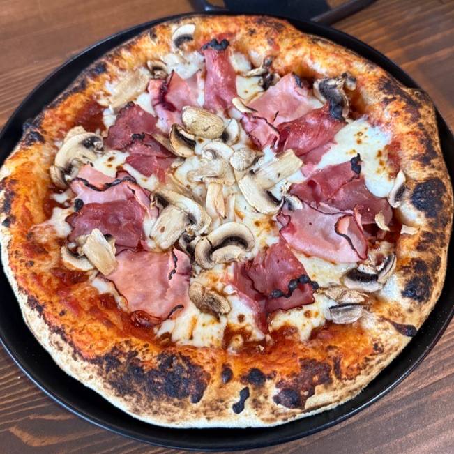 Pizza de 25cm con Roast beef, selva negra, champiñones y queso mozzarella, en masa artesanal de alta proteína y fermentación lenta.