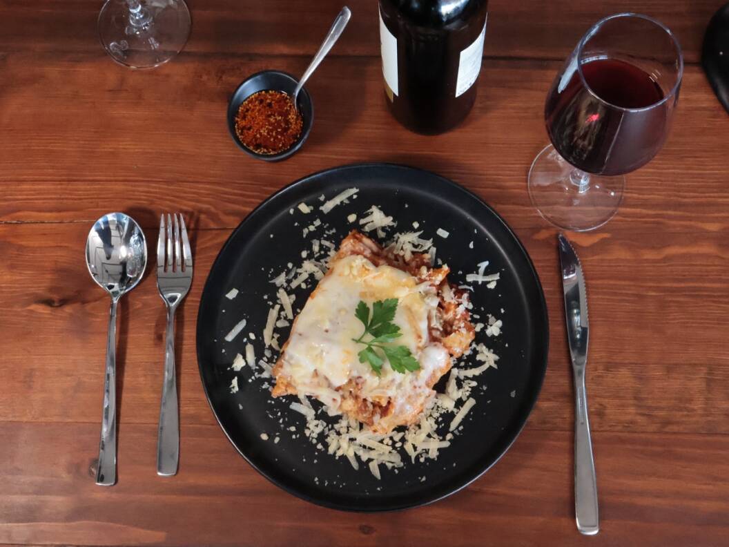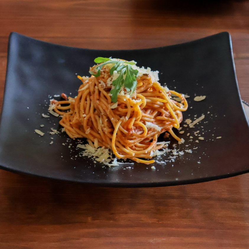 Espagueti en salsa boloñesa de la casa, con carne molida a la pimienta terminado con queso parmesano recién rallado.