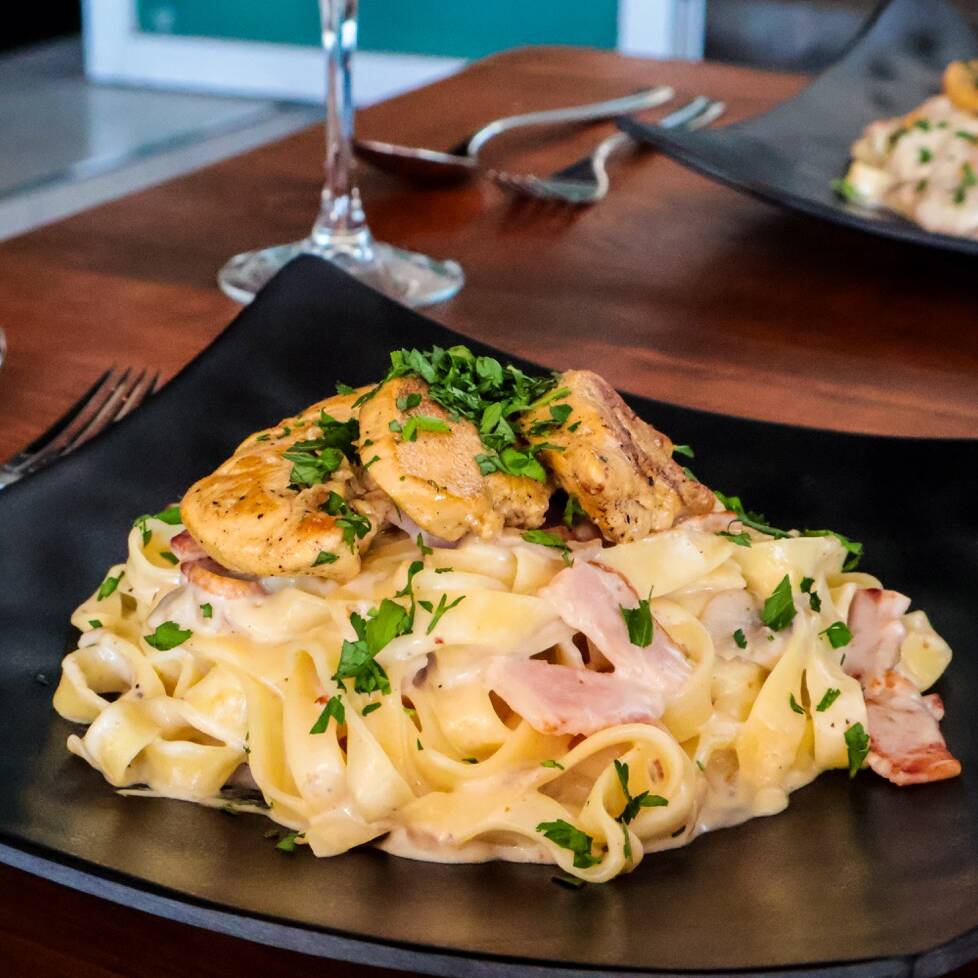 Pasta fetuccini, con champiñones salteados con tocino en salsa Alfredo, terminado con queso parmesano recién rallado.