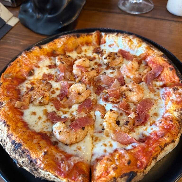 Pizza de 25cm con Camarones, tocino, ajo picado y Queso mozzarella, en masa artesanal de alta proteína y fermentación lenta.