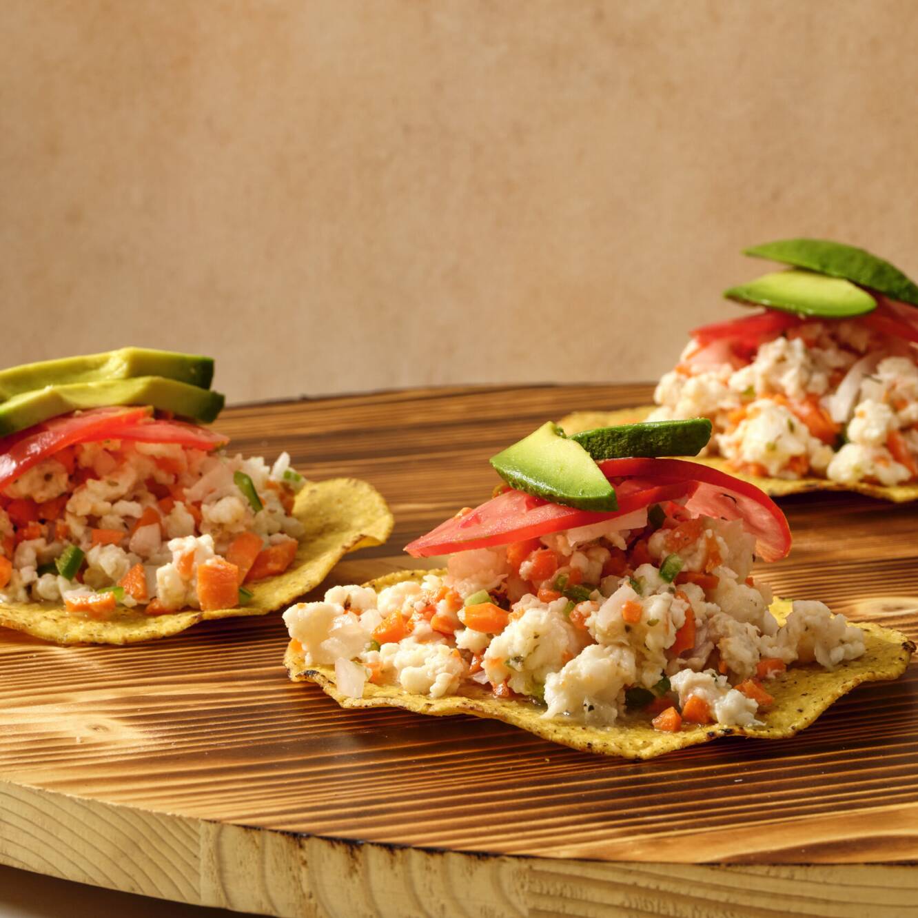 Tostada en torre, ceviche de pescado, aguacate en medio, ceviche de camarón. Acompañada de salsa especial de la casa.
