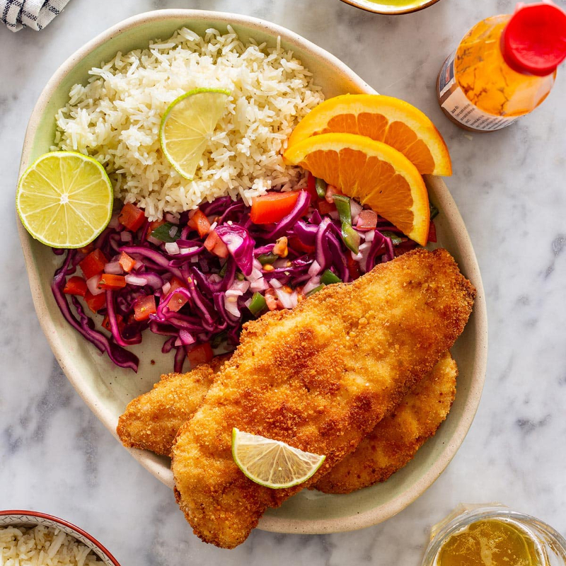 Rellenos de queso crema y empanizados. Servidos con arroz a la mantequilla y ensalada fresca.