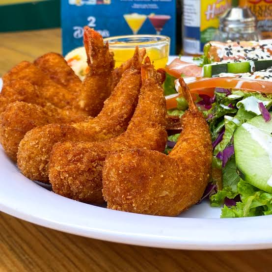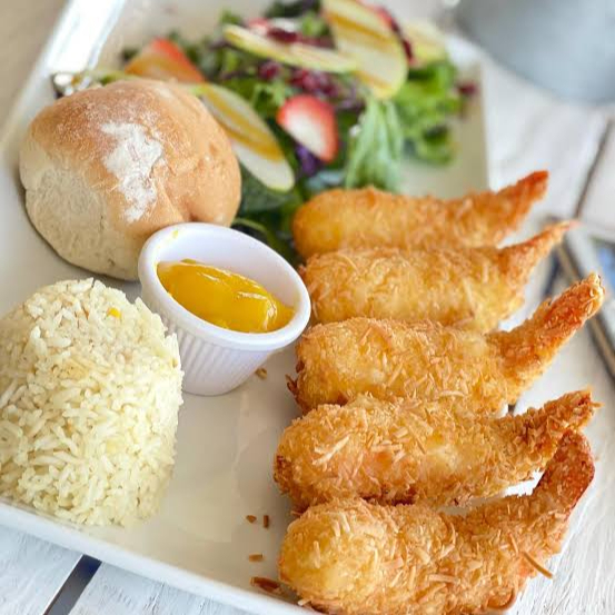 Rellenos de queso crema y empanizados con coco. Acompañados en salsa de mango. Se sirven con arroz a la mantequilla y ensalada.